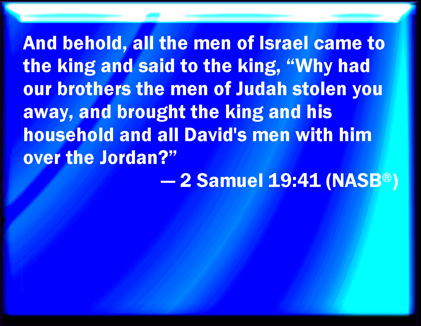 Bible Verse Slide 2 Samuel 19:41 And, behold, all the men of Israel came to the king, and said to the king, Why have our brothers the men of Judah stolen you away, and have brought the king, and his household, and all David's men with him, over Jordan? KJV: And, behold, all the men of Israel came to the king, and said unto the king, Why have our brethren the men of Judah stolen thee away, and have brought the king, and his household, and all David's men with him, over Jordan? DRB: Therefore all the men of Israel running together to the king, said to him: Why have our brethren the men of Juda stolen thee away, and have brought the king and his household over the Jordan, and all the men of David with him? DBT: And behold, all the men of Israel came to the king, and said to the king, Why have our brethren the men of Judah stolen thee away, and have brought the king, and his household, and all David's men with him, over the Jordan? ERV: And, behold, all the men of Israel came to the king; and said unto the king, Why have our brethren the men of Judah stolen thee away, and brought the king, and his household, over Jordan, and all David's men with him? WBT: And behold, all the men of Israel came to the king, and said to him, Why have our brethren the men of Judah stolen thee away, and have brought the king, and his household, and all David's men with him, over Jordan? WEB: Behold, all the men of Israel came to the king, and said to the king, "Why have our brothers the men of Judah stolen you away, and brought the king, and his household, over the Jordan, and all David's men with him?" YLT: And, lo, all the men of Israel are coming unto the king, and they say unto the king, 'Wherefore have they stolen thee — our brethren, the men of Judah?' (and they bring the king and his household over the Jordan, and all the men of David with him).Links 2 Samuel 19:41 NIV • 2 Samuel 19:41 NLT • 2 Samuel 19:41 ESV • 2 Samuel 19:41 NASB • 2 Samuel 19:41 KJV • 2 Samuel 19:41 Interlinear • 2 Samuel 19:41 Commentaries • 2 Samuel 19:41 Parallel Texts • 2 Samuel 19:41 Bible Apps • 2 Samuel 19:41 Parallel • Bible Hub |