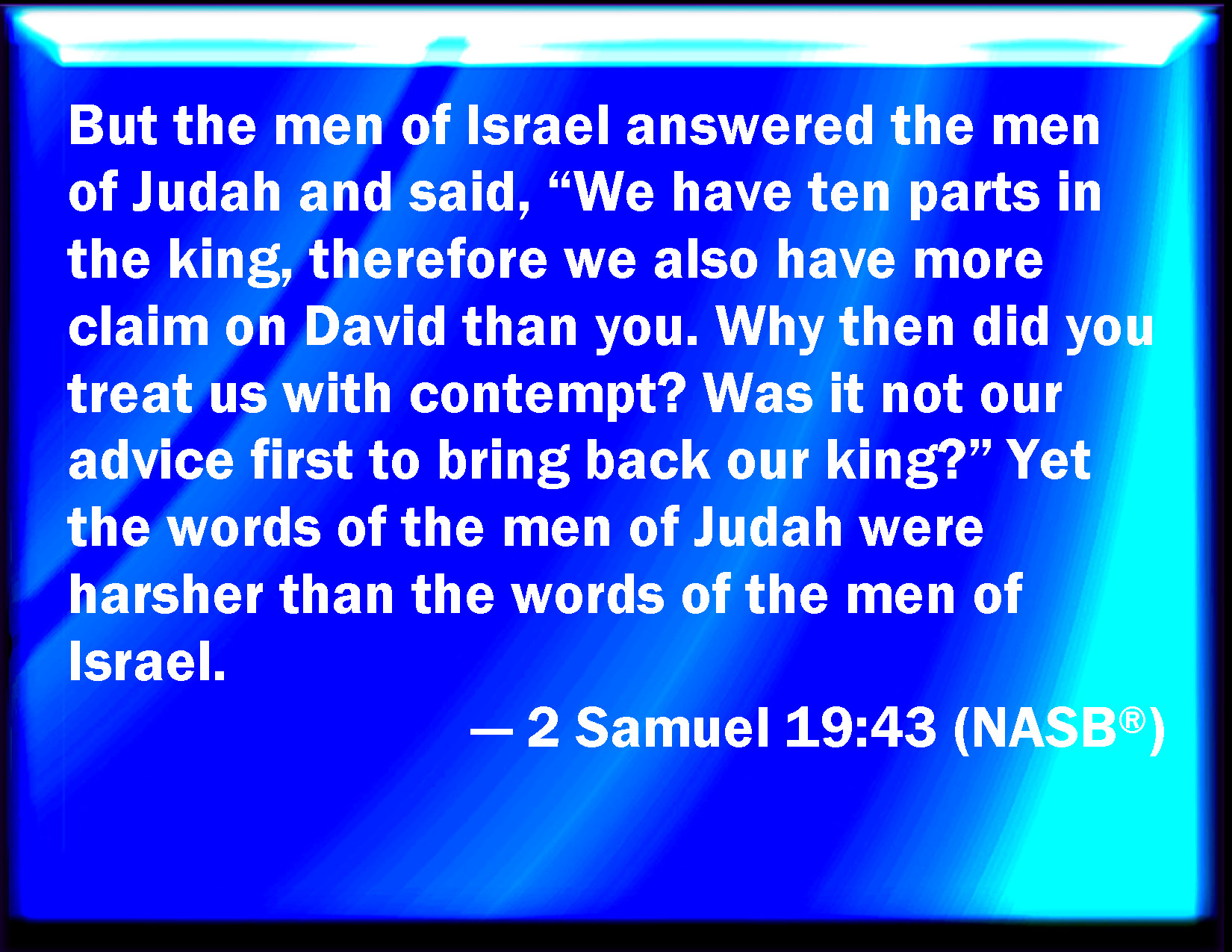 And the men of Israel answer the men of Judah, and say, 'Ten parts we have in the king, and also in David more than you; and wherefore have ye lightly esteemed us, that our word hath not been first to bring back our king?' And the word of the men of Judah is sharper than the word of the men of Israel.