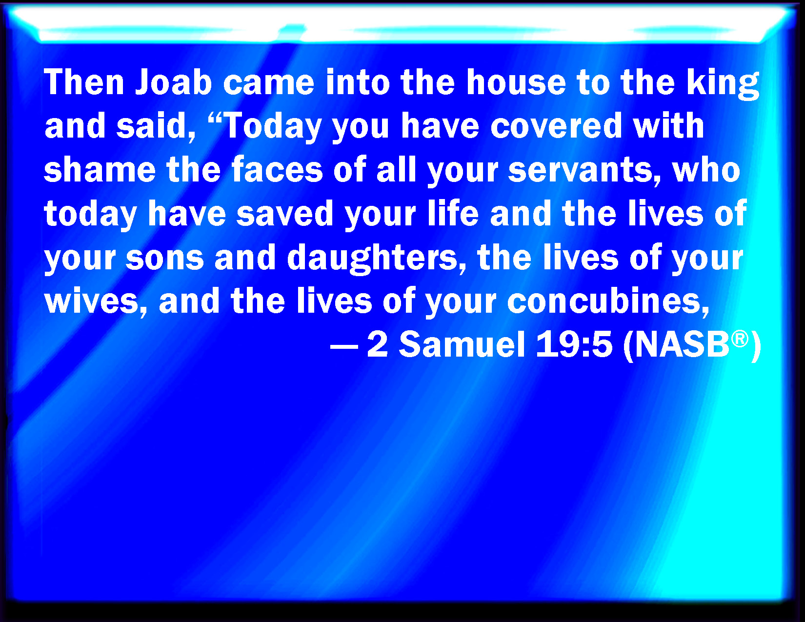 Bible Verse Slide 2 Samuel 19:5 And Joab came into the house to the king, and said, You have shamed this day the faces of all your servants, which this day have saved your life, and the lives of your sons and of your daughters, and the lives of your wives, and the lives of your concubines; KJV: And Joab came into the house to the king, and said, Thou hast shamed this day the faces of all thy servants, which this day have saved thy life, and the lives of thy sons and of thy daughters, and the lives of thy wives, and the lives of thy concubines; DRB: Then Joab going into the house to the king, said: Thou hast shamed this day the faces of all thy servants, that have saved thy life, and the lives of thy sons, and of thy daughters, and the lives of thy wives, and the lives of thy concubines. DBT: And Joab came into the house to the king, and said, Thou hast put to shame this day the faces of all thy servants who have this day saved thy life, and the lives of thy sons and of thy daughters, and the lives of thy wives and the lives of thy concubines; ERV: And Joab came into the house to the king, and said, Thou hast shamed this day the faces of all thy servants, which this day have saved thy life, and the lives of thy sons and of thy daughters, and the lives of thy wives, and the lives of thy concubines; WBT: And Joab came into the house to the king, and said, thou hast shamed this day the faces of all thy servants, who this day have saved thy life, and the lives of thy sons and of thy daughters, and the lives of thy wives, and the lives of thy concubines; WEB: Joab came into the house to the king, and said, "You have shamed this day the faces of all your servants, who this day have saved your life, and the lives of your sons and of your daughters, and the lives of your wives, and the lives of your concubines; YLT: And Joab cometh in unto the king to the house, and saith, 'Thou hast put to shame to-day the faces of all thy servants, those delivering thy life to-day, and the life of thy sons, and of thy daughters, and the life of thy wives, and the life of thy concubines,Links 2 Samuel 19:5 NIV • 2 Samuel 19:5 NLT • 2 Samuel 19:5 ESV • 2 Samuel 19:5 NASB • 2 Samuel 19:5 KJV • 2 Samuel 19:5 Interlinear • 2 Samuel 19:5 Commentaries • 2 Samuel 19:5 Parallel Texts • 2 Samuel 19:5 Bible Apps • 2 Samuel 19:5 Parallel • Bible Hub |