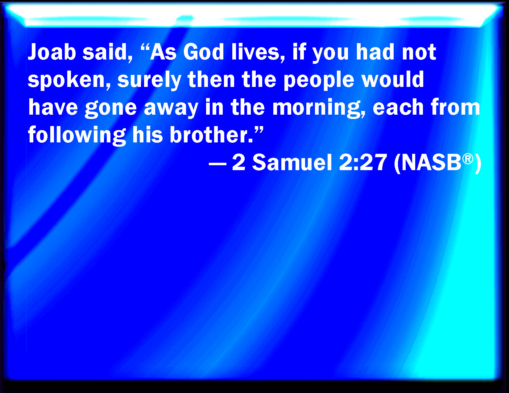 Bible Verse Slide 2 Samuel 2:27 And Joab said, As God lives, unless you had spoken, surely then in the morning the people had gone up every one from following his brother. KJV: And Joab said, As God liveth, unless thou hadst spoken, surely then in the morning the people had gone up every one from following his brother. DRB: And Joab said: As the Lord liveth, if thou hadst spoke sooner, even in the morning the people should have retired from pursuing after their brethren. DBT: And Joab said, As God liveth, unless thou hadst spoken, surely then in the morning the people had gone up every one from following his brother. ERV: And Joab said, As God liveth, if thou hadst not spoken, surely then in the morning the people had gone away, nor followed every one his brother. WBT: And Joab said, As God liveth, unless thou hadst spoken, surely then in the morning the people had gone up every one from following his brother. WEB: Joab said, "As God lives, if you had not spoken, surely then in the morning the people would have gone away, and not each followed his brother." YLT: And Joab saith, 'God liveth! for unless thou hadst spoken, surely then from the morning had the people gone up each from after his brother.'Links 2 Samuel 2:27 NIV • 2 Samuel 2:27 NLT • 2 Samuel 2:27 ESV • 2 Samuel 2:27 NASB • 2 Samuel 2:27 KJV • 2 Samuel 2:27 Interlinear • 2 Samuel 2:27 Commentaries • 2 Samuel 2:27 Parallel Texts • 2 Samuel 2:27 Bible Apps • 2 Samuel 2:27 Parallel • Bible Hub |