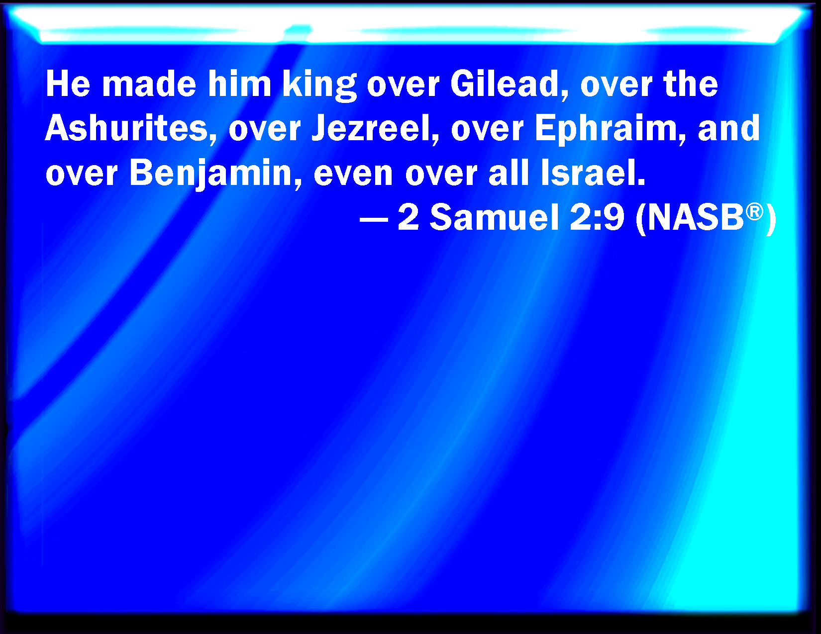 Bible Verse Slide 2 Samuel 2:9 And made him king over Gilead, and over the Ashurites, and over Jezreel, and over Ephraim, and over Benjamin, and over all Israel. KJV: And made him king over Gilead, and over the Ashurites, and over Jezreel, and over Ephraim, and over Benjamin, and over all Israel. DRB: And made him king over Galaad, and, over Gessuri, and over Jezrahel, and over Ephraim, and over Benjamin, and over all Israel. DBT: and made him king over Gilead, and over the Asshurites, and over Jizreel, and over Ephraim, and over Benjamin, and over all Israel. ERV: and he made him king over Gilead, and over the Ashurites, and over Jezreel, and over Ephraim, and over Benjamin, and over all Israel. WBT: And he made him king over Gilead, and over the Ashurites, and over Jezreel, and over Ephraim, and over Benjamin, and over all Israel. WEB: and he made him king over Gilead, and over the Ashurites, and over Jezreel, and over Ephraim, and over Benjamin, and over all Israel. YLT: and causeth him to reign over Gilead, and over the Ashurite, and over Jezreel, and over Ephraim, and over Benjamin, and over Israel — all of it.Links 2 Samuel 2:9 NIV • 2 Samuel 2:9 NLT • 2 Samuel 2:9 ESV • 2 Samuel 2:9 NASB • 2 Samuel 2:9 KJV • 2 Samuel 2:9 Interlinear • 2 Samuel 2:9 Commentaries • 2 Samuel 2:9 Parallel Texts • 2 Samuel 2:9 Bible Apps • 2 Samuel 2:9 Parallel • Bible Hub |