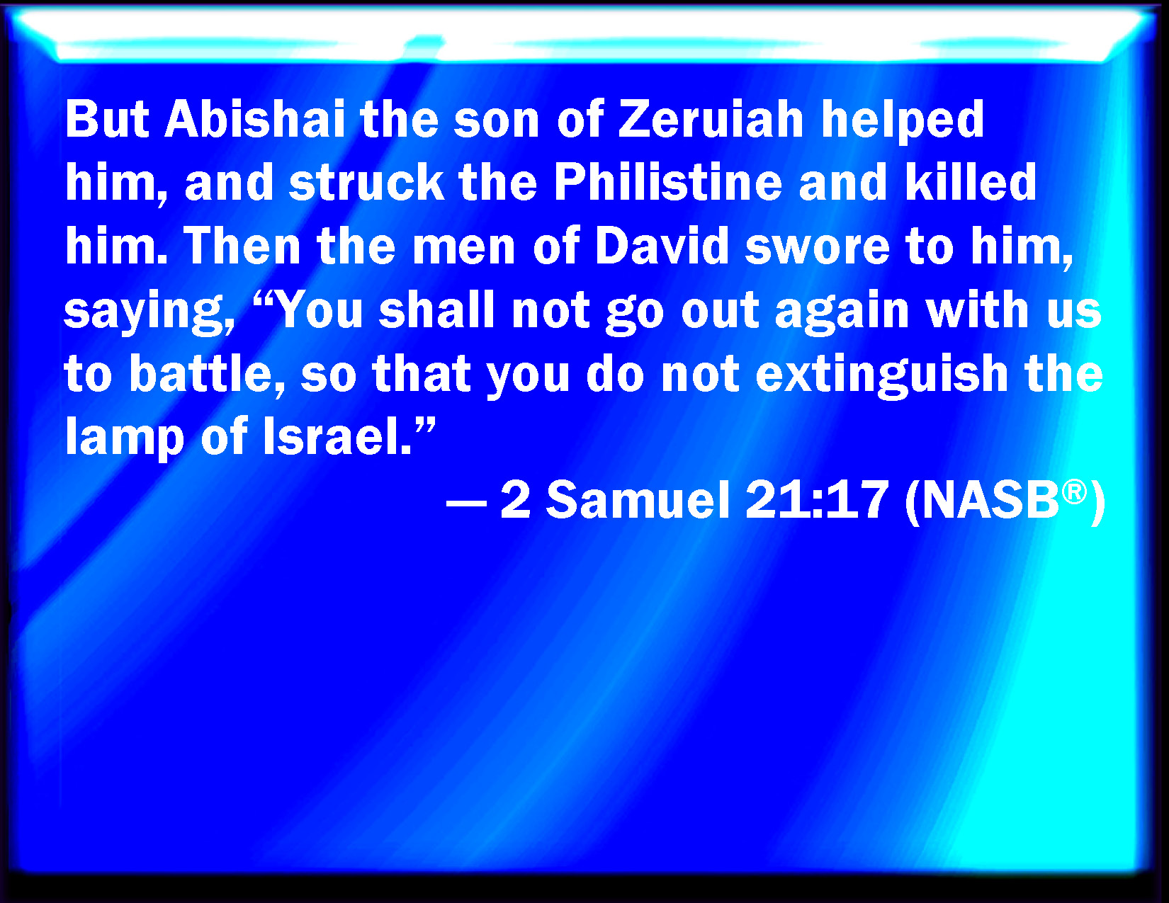 Bible Verse Slide 2 Samuel 21:17 But Abishai the son of Zeruiah succored him, and smote the Philistine, and killed him. Then the men of David swore to him, saying, You shall go no more out with us to battle, that you quench not the light of Israel. KJV: But Abishai the son of Zeruiah succoured him, and smote the Philistine, and killed him. Then the men of David sware unto him, saying, Thou shalt go no more out with us to battle, that thou quench not the light of Israel. DRB: And Abisai the son of Sarvia rescued him, and striking the Philistine killed him. Then David's men swore unto him, saying: Thou shalt go no more out with us to battle, lest thou put out the lamp of Israel. DBT: And Abishai the son of Zeruiah succoured him, and smote the Philistine and killed him. Then the men of David swore to him, saying, Thou shalt go no more out with us to battle, that thou quench not the lamp of Israel. ERV: But Abishai the son of Zeruiah succoured him, and smote the Philistine, and killed him. Then the men of David sware unto him, saying, Thou shalt go no more out with us to battle, that thou quench not the lamp of Israel. WBT: But Abishai the son of Zeruiah succored him, and smote the Philistine, and killed him. Then the men of David swore to him, saying, Thou shalt go out no more with us to battle, that thou mayest not extinguish the light of Israel. WEB: But Abishai the son of Zeruiah helped him, and struck the Philistine, and killed him. Then the men of David swore to him, saying, "You shall go no more out with us to battle, that you don't quench the lamp of Israel." YLT: and Abishai son of Zeruiah giveth help to him, and smiteth the Philistine, and putteth him to death; then swear the men of David to him, saying, 'Thou dost not go out again with us to battle, nor quench the lamp of Israel.'Links 2 Samuel 21:17 NIV • 2 Samuel 21:17 NLT • 2 Samuel 21:17 ESV • 2 Samuel 21:17 NASB • 2 Samuel 21:17 KJV • 2 Samuel 21:17 Interlinear • 2 Samuel 21:17 Commentaries • 2 Samuel 21:17 Parallel Texts • 2 Samuel 21:17 Bible Apps • 2 Samuel 21:17 Parallel • Bible Hub |