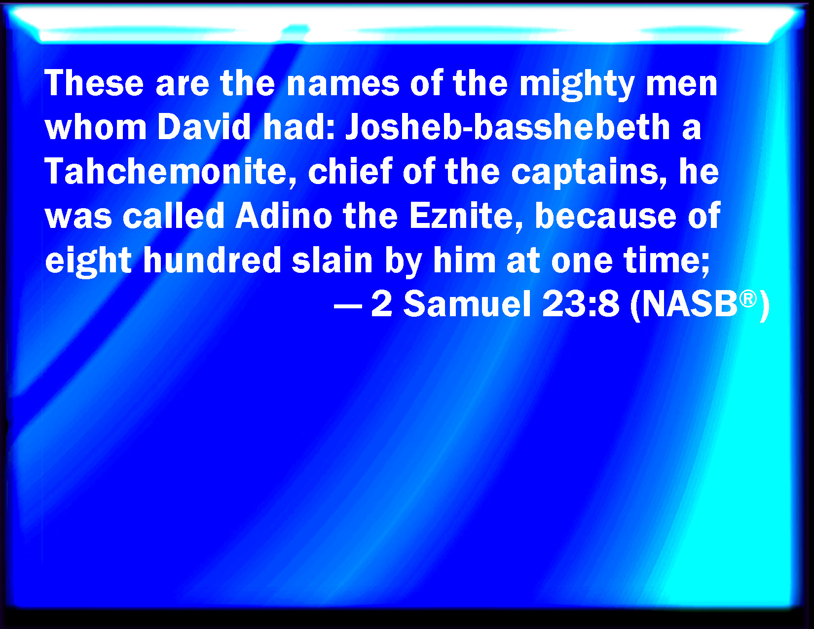 2 Samuel 23:8 These be the names of the mighty men whom David had: The Tachmonite that sat in the seat, chief among the captains; the same was Adino the Eznite: he lift up his spear against eight hundred, whom he slew at one time.