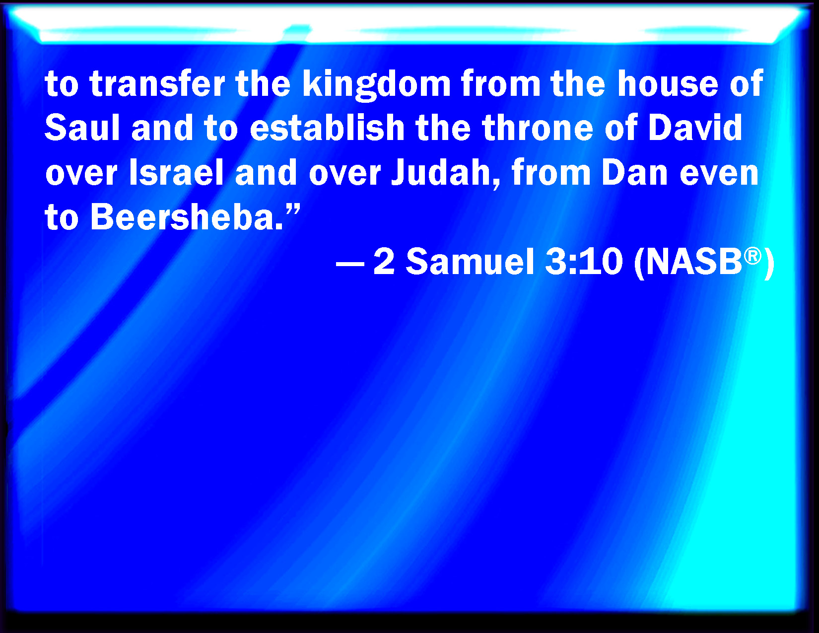 Bible Verse Slide 2 Samuel 3:10 To translate the kingdom from the house of Saul, and to set up the throne of David over Israel and over Judah, from Dan even to Beersheba. KJV: To translate the kingdom from the house of Saul, and to set up the throne of David over Israel and over Judah, from Dan even to Beersheba. DRB: That the kingdom be translated from the house of Saul, and the throne of David be set up over Israel, and over Juda from Dan to Bersabee. DBT: to translate the kingdom from the house of Saul, and to set up the throne of David over Israel and over Judah, from Dan even to Beer-sheba! ERV: to translate the kingdom from the house of Saul, and to set up the throne of David over Israel and over Judah, from Dan even to Beer-sheba. WBT: To translate the kingdom from the house of Saul, and to set up the throne of David over Israel and over Judah, from Dan even to Beer-sheba. WEB: to transfer the kingdom from the house of Saul, and to set up the throne of David over Israel and over Judah, from Dan even to Beersheba." YLT: to cause the kingdom to pass over from the house of Saul, and to raise up the throne of David over Israel, and over Judah, from Dan even unto Beer-Sheba.'Links 2 Samuel 3:10 NIV • 2 Samuel 3:10 NLT • 2 Samuel 3:10 ESV • 2 Samuel 3:10 NASB • 2 Samuel 3:10 KJV • 2 Samuel 3:10 Interlinear • 2 Samuel 3:10 Commentaries • 2 Samuel 3:10 Parallel Texts • 2 Samuel 3:10 Bible Apps • 2 Samuel 3:10 Parallel • Bible Hub |