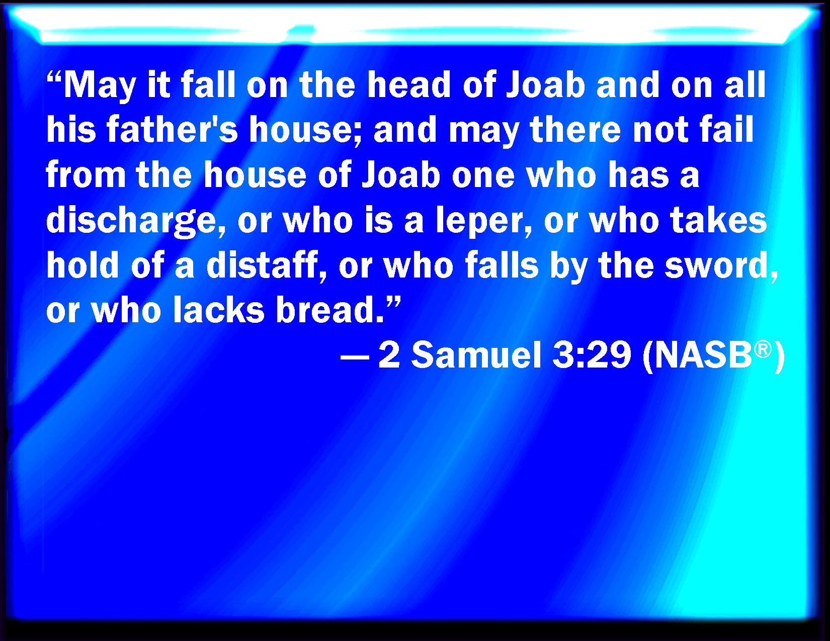 Bible Verse Slide 2 Samuel 3:29 Let it rest on the head of Joab, and on all his father's house; and let there not fail from the house of Joab one that has an issue, or that is a leper, or that leans on a staff, or that falls on the sword, or that lacks bread. KJV: Let it rest on the head of Joab, and on all his father's house; and let there not fail from the house of Joab one that hath an issue, or that is a leper, or that leaneth on a staff, or that falleth on the sword, or that lacketh bread. DRB: And may it come upon the head of Joab, and upon all his father's house: and let there not fail from the house of Joab one that hath an issue of seed, or that is a leper, or that holdeth the distaff, or that falleth by the sword, or that wanteth bread. DBT: let it fall on the head of Joab, and on all his father's house; and let there not fail from the house of Joab one that has an issue, or that is a leper, or that leans on a staff, or that falls by the sword, or that lacks bread! ERV: let it fall upon the head of Joab, and upon all his father's house; and let there not fail from the house of Joab one that hath an issue, or that is a leper, or that leaneth on a staff, or that falleth by the sword, or that lacketh bread. WBT: Let it rest on the head of Joab, and on all his father's house; and let there not fail from the house of Joab one that hath an issue, or that is a leper, or that leaneth on a staff, or that falleth on the sword, or that lacketh bread. WEB: Let it fall on the head of Joab, and on all his father's house. Let there not fail from the house of Joab one who has an issue, or who is a leper, or who leans on a staff, or who falls by the sword, or who lacks bread." YLT: it doth stay on the head of Joab, and on all the house of his father, and there is not cut off from the house of Joab one having an issue, and leprous, and laying hold on a staff, and falling by a sword, and lacking bread.'Links 2 Samuel 3:29 NIV • 2 Samuel 3:29 NLT • 2 Samuel 3:29 ESV • 2 Samuel 3:29 NASB • 2 Samuel 3:29 KJV • 2 Samuel 3:29 Interlinear • 2 Samuel 3:29 Commentaries • 2 Samuel 3:29 Parallel Texts • 2 Samuel 3:29 Bible Apps • 2 Samuel 3:29 Parallel • Bible Hub |