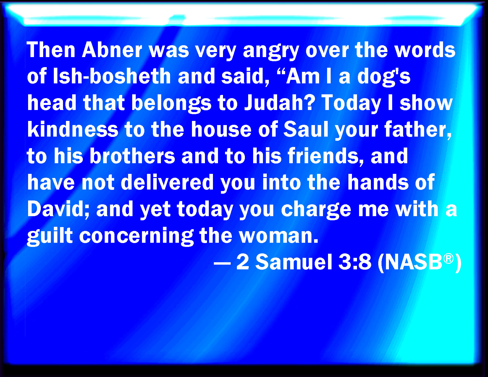 Bible Verse Slide 2 Samuel 3:8 Then was Abner very wroth for the words of Ishbosheth, and said, Am I a dog's head, which against Judah do show kindness this day to the house of Saul your father, to his brothers, and to his friends, and have not delivered you into the hand of David, that you charge me to day with a fault concerning this woman? KJV: Then was Abner very wroth for the words of Ishbosheth, and said, Am I a dog's head, which against Judah do shew kindness this day unto the house of Saul thy father, to his brethren, and to his friends, and have not delivered thee into the hand of David, that thou chargest me to day with a fault concerning this woman? DRB: Why didst thou go in to my father's concubine? And he was exceedingly angry for the words of Isboseth, and said: Am I a dog's head against Juda this day, who have shewn mercy to the house of Saul thy father, and to his brethren and friends, and have not delivered thee into the hands of David, and hast thou sought this day against me to charge me with a matter concerning a woman? DBT: Then was Abner very wroth for the words of Ishbosheth, and said, Am I a dog's head, I who against Judah do shew kindness this day to the house of Saul thy father, to his brethren, and to his friends, and have not delivered thee into the hand of David, that thou reproachest me this day with the fault of this woman? ERV: Then was Abner very wroth for the words of Ish-bosheth, and said, Am I a dog's head that belongeth to Judah? This day do I shew kindness unto the house of Saul thy father, to his brethren, and to his friends, and have not delivered thee into the hand of David, and yet thou chargest me this day with a fault concerning this woman. WBT: Then was Abner very wroth for the words of Ish-bosheth, and said, Am I a dog's head, who against Judah do show kindness this day to the house of Saul thy father, to his brethren, and to his friends, and have not delivered thee into the hand of David, that thou chargest me to-day with a fault concerning this woman? WEB: Then was Abner very angry for the words of Ishbosheth, and said, "Am I a dog's head that belongs to Judah? Today I show kindness to the house of Saul your father, to his brothers, and to his friends, and have not delivered you into the hand of David; and yet you charge me this day with a fault concerning this woman! YLT: And it is displeasing to Abner exceedingly, because of the words of Ish-Bosheth, and he saith, 'The head of a dog am I — that in reference to Judah to-day I do kindness with the house of Saul thy father, unto his brethren, and unto his friends, and have not delivered thee into the hand of David — that thou chargest against me iniquity concerning the woman to-day?Links 2 Samuel 3:8 NIV • 2 Samuel 3:8 NLT • 2 Samuel 3:8 ESV • 2 Samuel 3:8 NASB • 2 Samuel 3:8 KJV • 2 Samuel 3:8 Interlinear • 2 Samuel 3:8 Commentaries • 2 Samuel 3:8 Parallel Texts • 2 Samuel 3:8 Bible Apps • 2 Samuel 3:8 Parallel • Bible Hub |