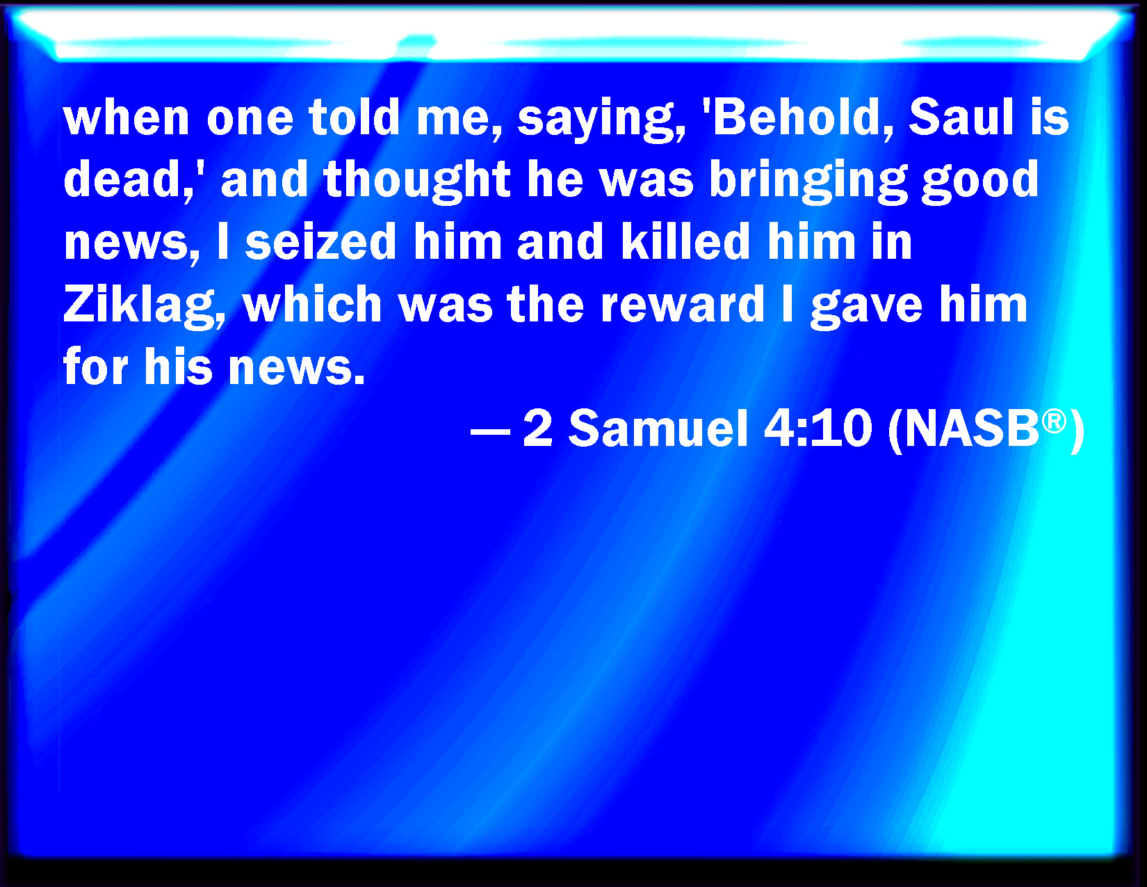 Bible Verse Slide 2 Samuel 4:10 When one told me, saying, Behold, Saul is dead, thinking to have brought good tidings, I took hold of him, and slew him in Ziklag, who thought that I would have given him a reward for his tidings: KJV: When one told me, saying, Behold, Saul is dead, thinking to have brought good tidings, I took hold of him, and slew him in Ziklag, who thought that I would have given him a reward for his tidings: DRB: The man that told me, and said: Saul is dead, who thought he brought good tidings, I apprehended, and slew him in Siceleg, who should have been rewarded for his news. DBT: when one told me, saying, Behold, Saul is dead! and he was in his own sight a messenger of good, I took hold of him, and slew him in Ziklag to whom forsooth I should give a reward for his good tidings: ERV: when one told me, saying, Behold, Saul is dead, thinking to have brought good tidings, I took hold of him, and slew him in Ziklag, which was the reward I gave him for his tidings. WBT: When one told me, saying, Behold, Saul is dead, (thinking to have brought good tidings,) I took hold of him, and slew him in Ziklag, who thought that I would have given him a reward for his tidings: WEB: when someone told me, 'Behold, Saul is dead,' thinking to have brought good news, I took hold of him, and killed him in Ziklag, which was the reward I gave him for his news. YLT: when one is declaring to me, saying, Lo, Saul is dead, and he was as a bearer of tidings in his own eyes, then I take hold on him, and slay him in Ziklag, instead of my giving to him for the tidings.Links 2 Samuel 4:10 NIV • 2 Samuel 4:10 NLT • 2 Samuel 4:10 ESV • 2 Samuel 4:10 NASB • 2 Samuel 4:10 KJV • 2 Samuel 4:10 Interlinear • 2 Samuel 4:10 Commentaries • 2 Samuel 4:10 Parallel Texts • 2 Samuel 4:10 Bible Apps • 2 Samuel 4:10 Parallel • Bible Hub |