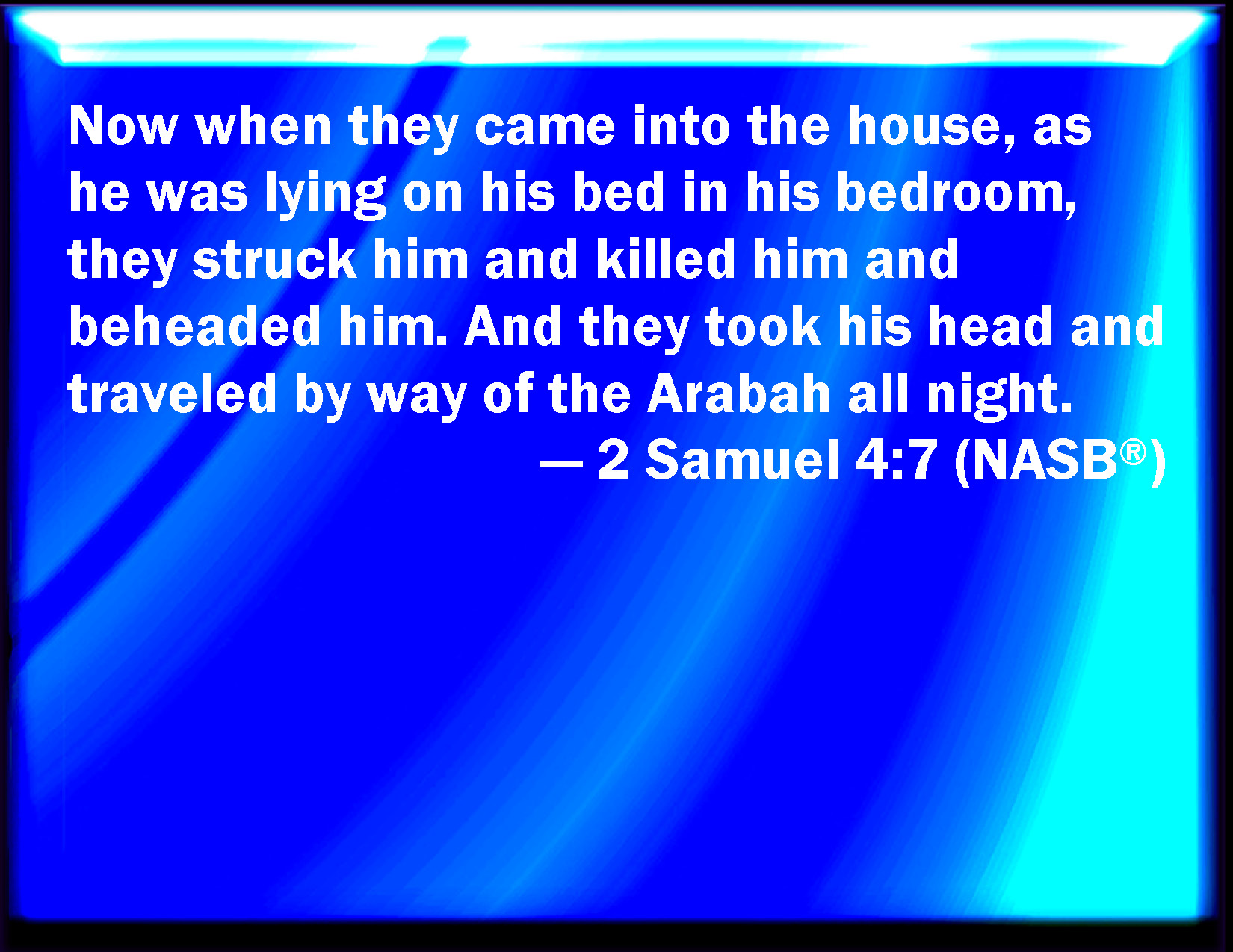 Bible Verse Slide 2 Samuel 4:7 For when they came into the house, he lay on his bed in his bedchamber, and they smote him, and slew him, and beheaded him, and took his head, and got them away through the plain all night. KJV: For when they came into the house, he lay on his bed in his bedchamber, and they smote him, and slew him, and beheaded him, and took his head, and gat them away through the plain all night. DRB: For when they came into the house, be was sleeping upon his bed in a parlour, and they struck him and killed him: and taking away his head they went off by the way of the wilderness, walking all night. DBT: They came into the house, as he lay on his bed in his bedchamber, and they smote him, and slew him, and beheaded him; and they took his head, and went by the way of the plain all night. ERV: Now when they came into the house, as he lay on his bed in his bedchamber, they smote him, and slew him, and beheaded him, and took his head, and went by the way of the Arabah all night. WBT: For when they came into the house, he lay on his bed in his bed-chamber, and they smote him, and slew him, and beheaded him, and took his head, and went away through the plain all night. WEB: Now when they came into the house, as he lay on his bed in his bedroom, they struck him, and killed him, and beheaded him, and took his head, and went by the way of the Arabah all night. YLT: yea, they come in to the house, and he is lying on his bed, in the inner part of his bed-chamber, and they smite him, and put him to death, and turn aside his head, and they take his head, and go the way of the plain all the night,Links 2 Samuel 4:7 NIV • 2 Samuel 4:7 NLT • 2 Samuel 4:7 ESV • 2 Samuel 4:7 NASB • 2 Samuel 4:7 KJV • 2 Samuel 4:7 Interlinear • 2 Samuel 4:7 Commentaries • 2 Samuel 4:7 Parallel Texts • 2 Samuel 4:7 Bible Apps • 2 Samuel 4:7 Parallel • Bible Hub |