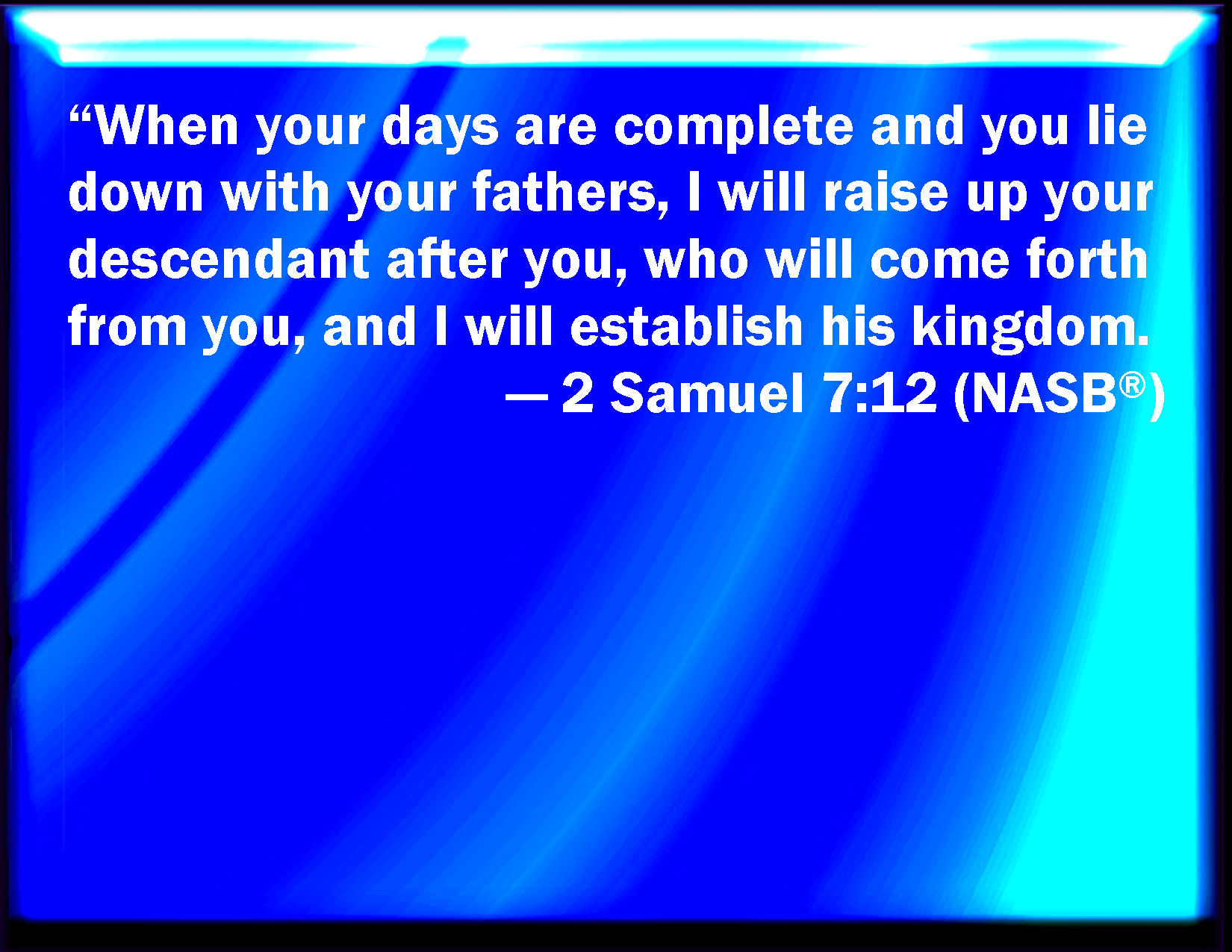 Bible Verse Slide 2 Samuel 7:12 And when your days be fulfilled, and you shall sleep with your fathers, I will set up your seed after you, which shall proceed out of your bowels, and I will establish his kingdom. KJV: And when thy days be fulfilled, and thou shalt sleep with thy fathers, I will set up thy seed after thee, which shall proceed out of thy bowels, and I will establish his kingdom. DRB: And when thy days shall be fulfilled, and thou shalt sleep with thy fathers, I will raise up thy seed after thee, which shall proceed out of thy bowels, and I will establish his kingdom. DBT: When thy days are fulfilled, and thou shalt sleep with thy fathers, I will set up thy seed after thee, which shall proceed out of thy bowels, and I will establish his kingdom. ERV: When thy days be fulfilled, and thou shalt sleep with thy fathers, I will set up thy seed after thee, which shall proceed out of thy bowels, and I will establish his kingdom. WBT: And when thy days shall be fulfilled, and thou shalt sleep with thy fathers, I will set up thy seed after thee, which shall proceed out of thy bowels, and I will establish his kingdom. WEB: When your days are fulfilled, and you shall sleep with your fathers, I will set up your seed after you, who shall proceed out of your bowels, and I will establish his kingdom. YLT: 'When thy days are full, and thou hast lain with thy fathers, then I have raised up thy seed after thee which goeth out from thy bowels, and have established his kingdom;Links 2 Samuel 7:12 NIV • 2 Samuel 7:12 NLT • 2 Samuel 7:12 ESV • 2 Samuel 7:12 NASB • 2 Samuel 7:12 KJV • 2 Samuel 7:12 Interlinear • 2 Samuel 7:12 Commentaries • 2 Samuel 7:12 Parallel Texts • 2 Samuel 7:12 Bible Apps • 2 Samuel 7:12 Parallel • Bible Hub |