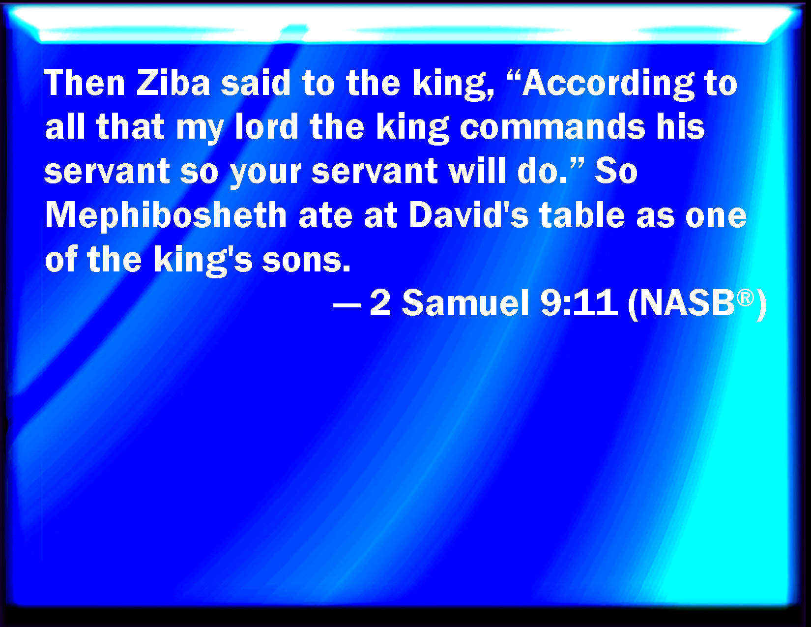 Bible Verse Slide 2 Samuel 9:11 Then said Ziba to the king, According to all that my lord the king has commanded his servant, so shall your servant do. As for Mephibosheth, said the king, he shall eat at my table, as one of the king's sons. KJV: Then said Ziba unto the king, According to all that my lord the king hath commanded his servant, so shall thy servant do. As for Mephibosheth, said the king, he shall eat at my table, as one of the king's sons. DRB: And Siba said to the king: As thou my lord the king hast commanded thy servant, so will thy servant do: and Miphiboseth shall eat at my table, as one of the sons of the king. DBT: And Ziba said to the king, According to all that my lord the king has commanded his servant, so will thy servant do. And Mephibosheth said David shall eat at my table, as one of the king's sons. ERV: Then said Ziba unto the king, According to all that my lord the king commandeth his servant, so shall thy servant do. As for Mephibosheth, said the king, he shall eat at my table, as one of the kings sons. WBT: Then said Ziba to the king, According to all that my lord the king hath commanded his servant, so shall thy servant do. As for Mephibosheth, said the king, he shall eat at my table, as one of the king's sons. WEB: Then Ziba said to the king, "According to all that my lord the king commands his servant, so your shall servant do." So Mephibosheth ate at the king's table, like one of the king's sons. YLT: And Ziba saith unto the king, 'According to all that my lord the king commandeth his servant, so doth thy servant;' as to Mephibosheth, 'he is eating at my table (saith the king) as one of the sons of the king.'Links 2 Samuel 9:11 NIV • 2 Samuel 9:11 NLT • 2 Samuel 9:11 ESV • 2 Samuel 9:11 NASB • 2 Samuel 9:11 KJV • 2 Samuel 9:11 Interlinear • 2 Samuel 9:11 Commentaries • 2 Samuel 9:11 Parallel Texts • 2 Samuel 9:11 Bible Apps • 2 Samuel 9:11 Parallel • Bible Hub |