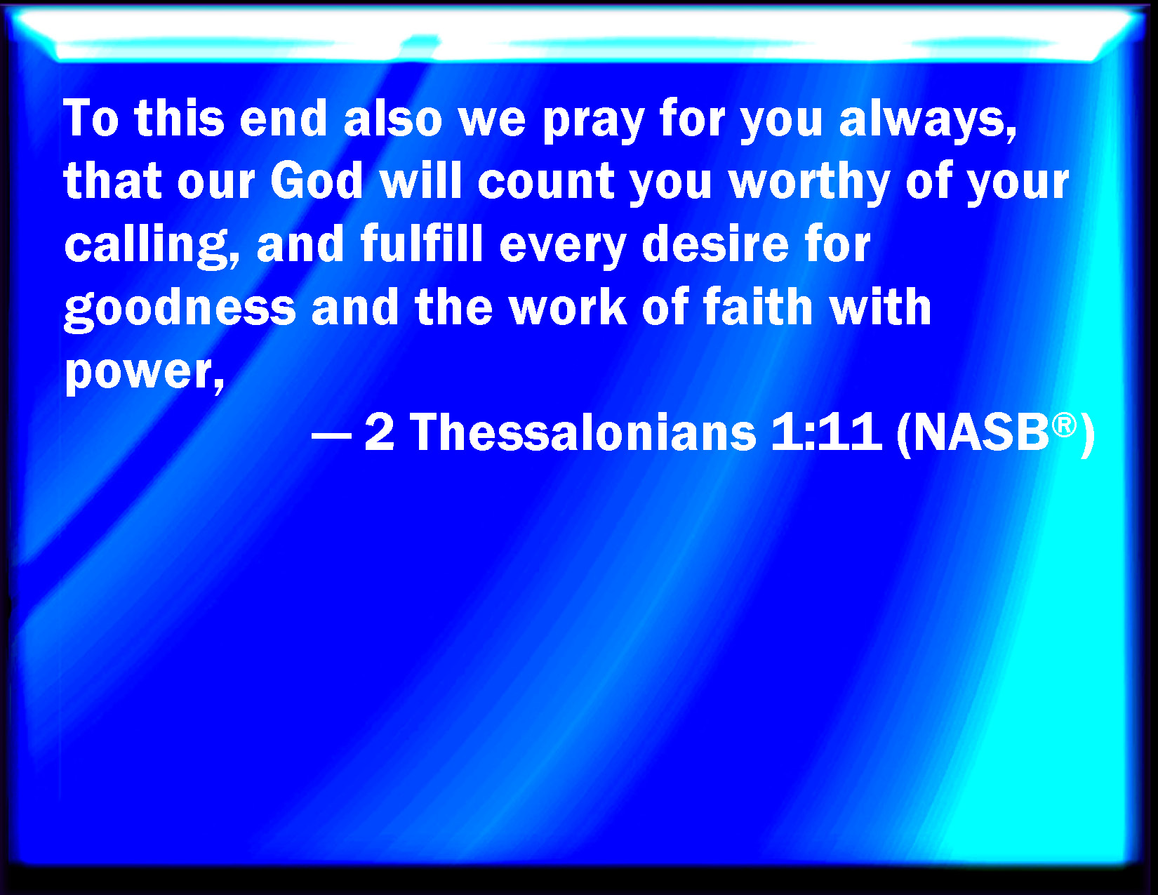 Bible Verse Slide 2 Thessalonians 1:11 Why also we pray always for you, that our God would count you worthy of this calling, and fulfill all the good pleasure of his goodness, and the work of faith with power: KJV: Wherefore also we pray always for you, that our God would count you worthy of this calling, and fulfil all the good pleasure of his goodness, and the work of faith with power: DRB: Wherefore also we pray always for you; that our God would make you worthy of his vocation, and fulfill all the good pleasure of his goodness and the work of faith in power; DBT: To which end we also pray always for you, that our God may count you worthy of the calling, and fulfil all the good pleasure of his goodness and the work of faith with power, ERV: To which end we also pray always for you, that our God may count you worthy of your calling, and fulfill every desire of goodness and every work of faith, with power; WBT: Wherefore also we pray always for you, that our God would count you worthy of this calling, and fulfill all the good pleasure of his goodness, and the work of faith with power: WEB: To this end we also pray always for you, that our God may count you worthy of your calling, and fulfill every desire of goodness and work of faith, with power; YLT: for which also we do pray always for you, that our God may count you worthy of the calling, and may fulfil all the good pleasure of goodness, and the work of the faith in power,Links 2 Thessalonians 1:11 NIV • 2 Thessalonians 1:11 NLT • 2 Thessalonians 1:11 ESV • 2 Thessalonians 1:11 NASB • 2 Thessalonians 1:11 KJV • 2 Thessalonians 1:11 Interlinear • 2 Thessalonians 1:11 Commentaries • 2 Thessalonians 1:11 Parallel Texts • 2 Thessalonians 1:11 Bible Apps • 2 Thessalonians 1:11 Parallel • Bible Hub |