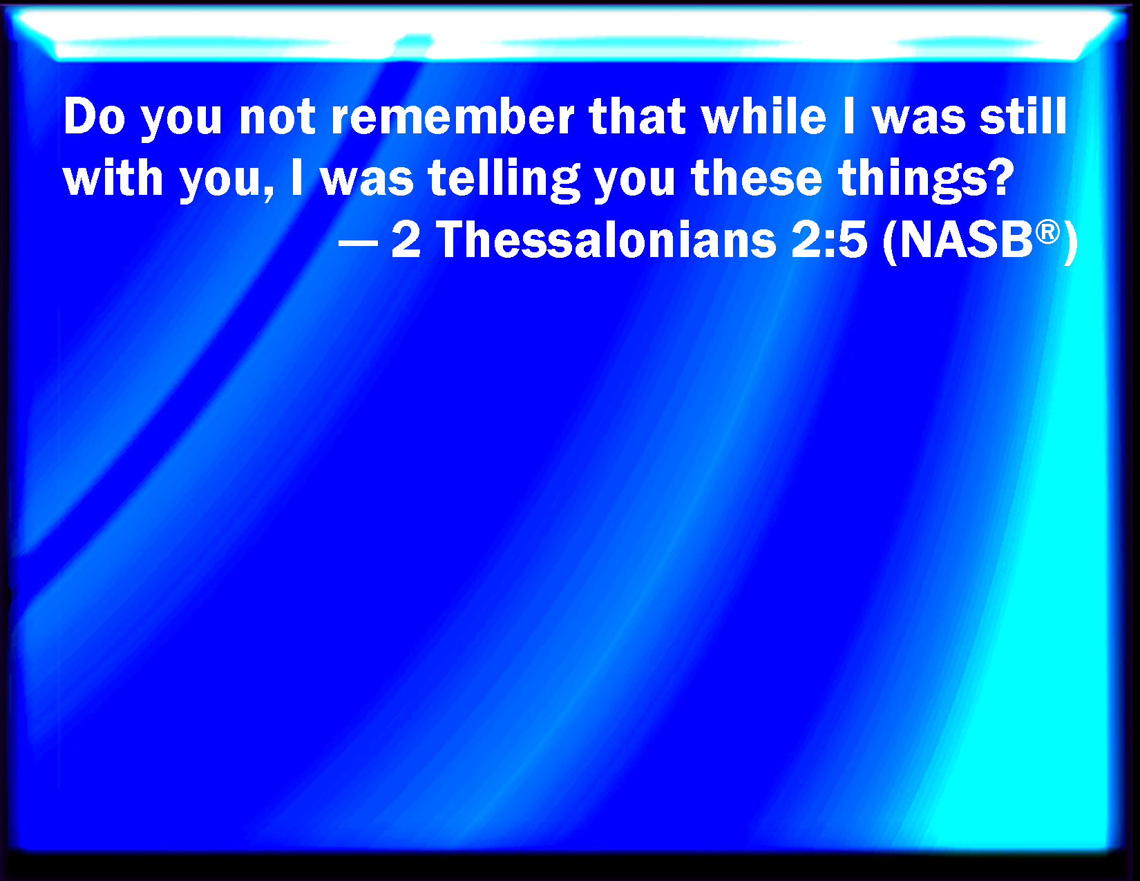 Bible Verse Slide 2 Thessalonians 2:5 Remember you not, that, when I was yet with you, I told you these things? KJV: Remember ye not, that, when I was yet with you, I told you these things? DRB: Remember you not, that when I was yet with you, I told you these things? DBT: Do ye not remember that, being yet with you, I said these things to you? ERV: Remember ye not, that, when I was yet with you, I told you these things? WBT: Remember ye not, that when I was yet with you, I told you these things? WEB: Don't you remember that, when I was still with you, I told you these things? YLT: Do ye not remember that, being yet with you, these things I said to you?Links 2 Thessalonians 2:5 NIV • 2 Thessalonians 2:5 NLT • 2 Thessalonians 2:5 ESV • 2 Thessalonians 2:5 NASB • 2 Thessalonians 2:5 KJV • 2 Thessalonians 2:5 Interlinear • 2 Thessalonians 2:5 Commentaries • 2 Thessalonians 2:5 Parallel Texts • 2 Thessalonians 2:5 Bible Apps • 2 Thessalonians 2:5 Parallel • Bible Hub |