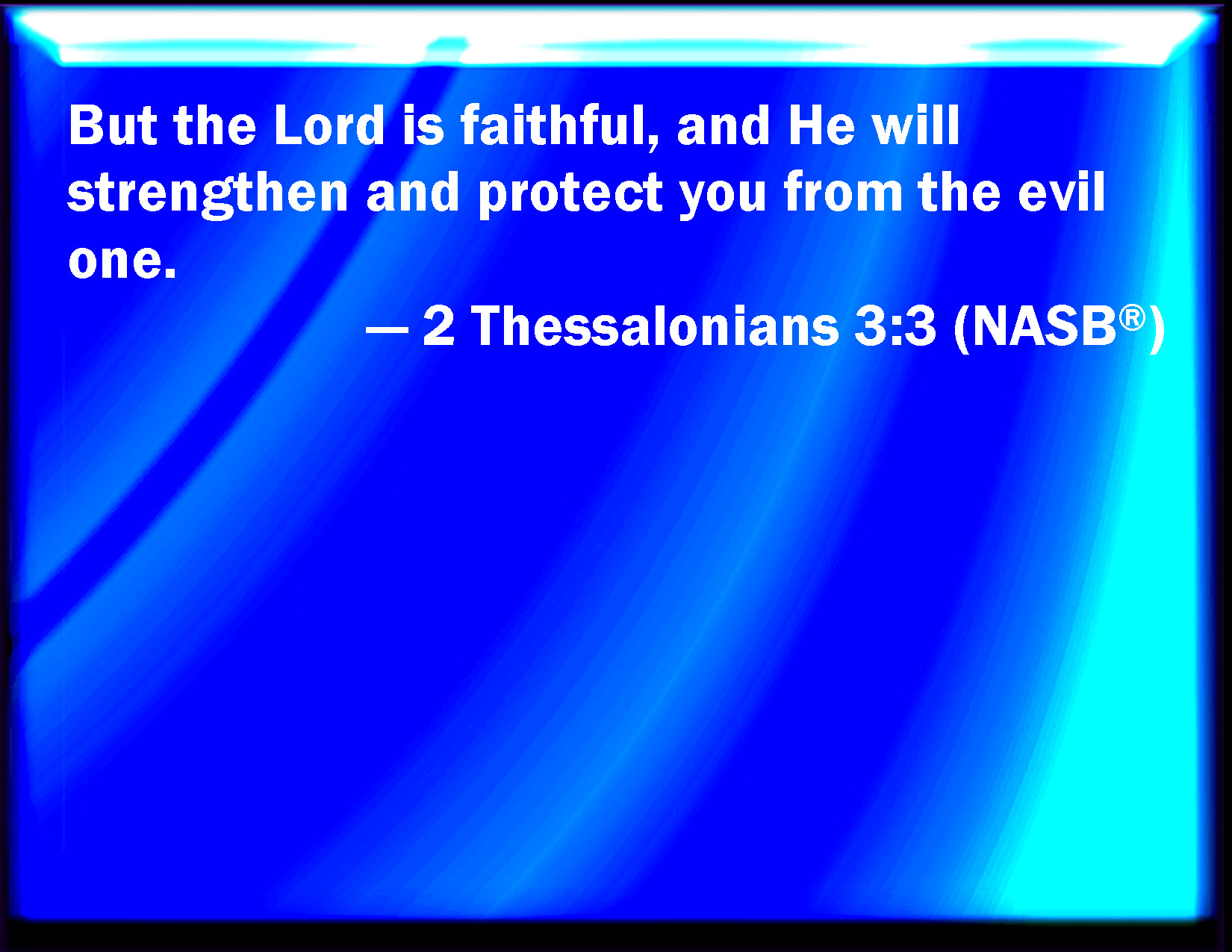Bible Verse Slide 2 Thessalonians 3:3 But the Lord is faithful, who shall establish you, and keep you from evil. KJV: But the Lord is faithful, who shall stablish you, and keep you from evil. DRB: But God is faithful, who will strengthen and keep you from evil. DBT: But the Lord is faithful, who shall establish you and keep you from evil. ERV: But the Lord is faithful, who shall stablish you, and guard you from the evil one. WBT: But the Lord is faithful, who will establish you, and keep you from evil. WEB: But the Lord is faithful, who will establish you, and guard you from the evil one. YLT: and stedfast is the Lord, who shall establish you, and shall guard you from the evil;Links 2 Thessalonians 3:3 NIV • 2 Thessalonians 3:3 NLT • 2 Thessalonians 3:3 ESV • 2 Thessalonians 3:3 NASB • 2 Thessalonians 3:3 KJV • 2 Thessalonians 3:3 Interlinear • 2 Thessalonians 3:3 Commentaries • 2 Thessalonians 3:3 Parallel Texts • 2 Thessalonians 3:3 Bible Apps • 2 Thessalonians 3:3 Parallel • Bible Hub |