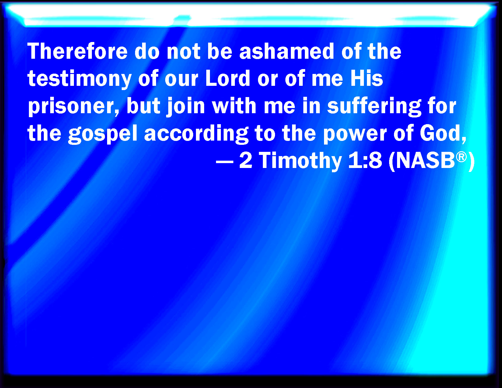 Bible Verse Slide 2 Timothy 1:8 Be not you therefore ashamed of the testimony of our Lord, nor of me his prisoner: but be you partaker of the afflictions of the gospel according to the power of God; KJV: Be not thou therefore ashamed of the testimony of our Lord, nor of me his prisoner: but be thou partaker of the afflictions of the gospel according to the power of God; DRB: Be not thou therefore ashamed of the testimony of our Lord, nor of me his prisoner: but labour with the gospel, according to the power of God, DBT: Be not therefore ashamed of the testimony of our Lord, nor of me his prisoner; but suffer evil along with the glad tidings, according to the power of God; ERV: Be not ashamed therefore of the testimony of our Lord, nor of me his prisoner: but suffer hardship with the gospel according to the power of God; WBT: Be not thou therefore ashamed of the testimony of our Lord, nor of me his prisoner: but be thou partaker of the afflictions of the gospel according to the power of God; WEB: Therefore don't be ashamed of the testimony of our Lord, nor of me his prisoner; but endure hardship for the Good News according to the power of God, YLT: therefore thou mayest not be ashamed of the testimony of our Lord, nor of me his prisoner, but do thou suffer evil along with the good news according to the power of God,Links 2 Timothy 1:8 NIV • 2 Timothy 1:8 NLT • 2 Timothy 1:8 ESV • 2 Timothy 1:8 NASB • 2 Timothy 1:8 KJV • 2 Timothy 1:8 Interlinear • 2 Timothy 1:8 Commentaries • 2 Timothy 1:8 Parallel Texts • 2 Timothy 1:8 Bible Apps • 2 Timothy 1:8 Parallel • Bible Hub |