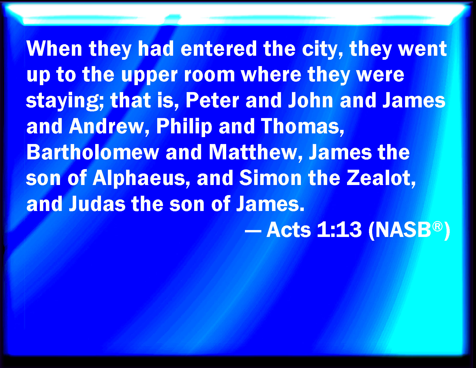 Bible Verse Slide Acts 1:13 And when they were come in, they went up into an upper room, where stayed both Peter, and James, and John, and Andrew, Philip, and Thomas, Bartholomew, and Matthew, James the son of Alphaeus, and Simon Zelotes, and Judas the brother of James. KJV: And when they were come in, they went up into an upper room, where abode both Peter, and James, and John, and Andrew, Philip, and Thomas, Bartholomew, and Matthew, James the son of Alphaeus, and Simon Zelotes, and Judas the brother of James. DRB: And when they were come in, they went up into an upper room, where abode Peter and John, James and Andrew, Philip and Thomas, Bartholomew and Matthew, James of Alpheus, and Simon Zelotes, and Jude the brother of James. DBT: And when they were come into the city, they went up to the upper chamber, where were staying both Peter, and John, and James, and Andrew, Philip and Thomas, Bartholomew and Matthew, James son of Alphaeus, and Simon the zealot, and Jude the brother of James. ERV: And when they were come in, they went up into the upper chamber, where they were abiding; both Peter and John and James and Andrew, Philip and Thomas, Bartholomew and Matthew, James the son of Alphaeus, and Simon the Zealot, and Judas the son of James. WBT: And when they had come in, they went into an upper room, where abode both Peter, and James, and John, and Andrew, Philip, and Thomas, Bartholomew, and Matthew, James the son of Alpheus, and Simon Zelotes, and Judas the brother of James. WEB: When they had come in, they went up into the upper room, where they were staying; that is Peter, John, James, Andrew, Philip, Thomas, Bartholomew, Matthew, James the son of Alphaeus, Simon the Zealot, and Judas the son of James. YLT: and when they came in, they went up to the upper room, where were abiding both Peter, and James, and John, and Andrew, Philip, and Thomas, Bartholomew, and Matthew, James, of Alphaeus, and Simon the Zelotes, and Judas, of James;Links Acts 1:13 NIV • Acts 1:13 NLT • Acts 1:13 ESV • Acts 1:13 NASB • Acts 1:13 KJV • Acts 1:13 Interlinear • Acts 1:13 Commentaries • Acts 1:13 Parallel Texts • Acts 1:13 Bible Apps • Acts 1:13 Parallel • Bible Hub |