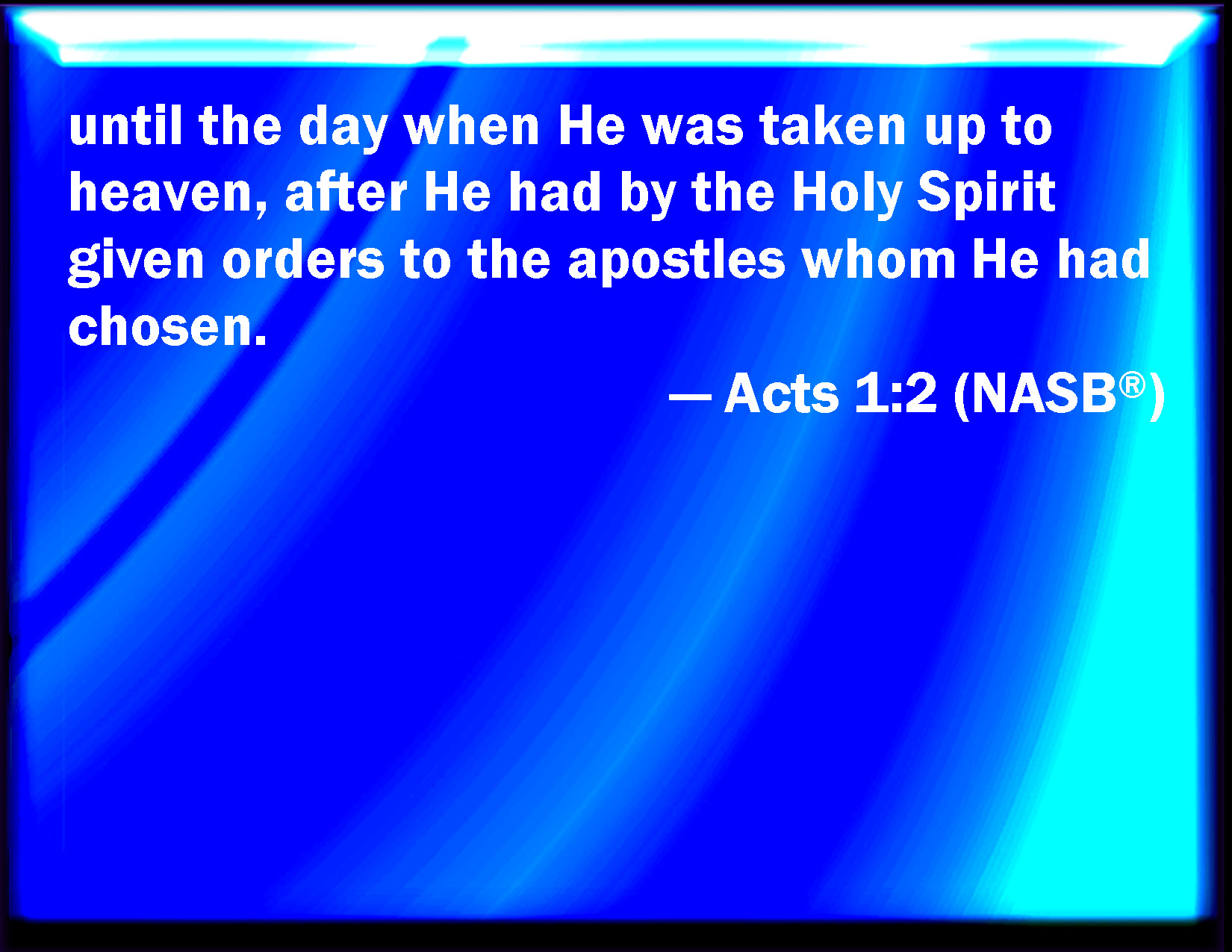 Bible Verse Slide Acts 1:2 Until the day in which he was taken up, after that he through the Holy Ghost had given commandments to the apostles whom he had chosen: KJV: Until the day in which he was taken up, after that he through the Holy Ghost had given commandments unto the apostles whom he had chosen: DRB: Until the day on which, giving commandments by the Holy Ghost to the apostles whom he had chosen, he was taken up. DBT: until that day in which, having by the Holy Spirit charged the apostles whom he had chosen, he was taken up; ERV: until the day in which he was received up, after that he had given commandment through the Holy Ghost unto the apostles whom he had chosen: WBT: Until the day in which he was taken up, after that he through the Holy Spirit had given commandments to the apostles whom he had chosen: WEB: until the day in which he was received up, after he had given commandment through the Holy Spirit to the apostles whom he had chosen. YLT: till the day in which, having given command, through the Holy Spirit, to the apostles whom he did choose out, he was taken up,Links Acts 1:2 NIV • Acts 1:2 NLT • Acts 1:2 ESV • Acts 1:2 NASB • Acts 1:2 KJV • Acts 1:2 Interlinear • Acts 1:2 Commentaries • Acts 1:2 Parallel Texts • Acts 1:2 Bible Apps • Acts 1:2 Parallel • Bible Hub |