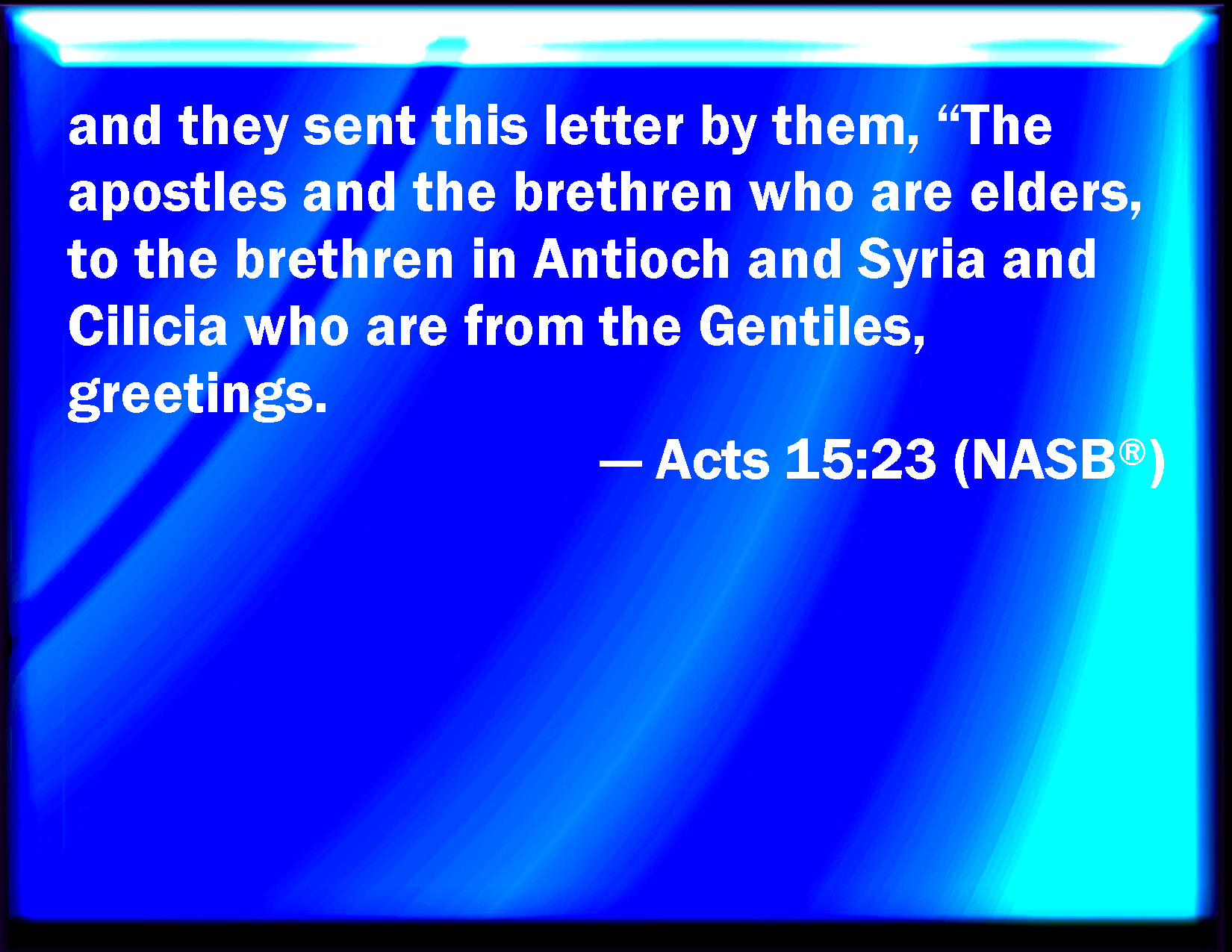 Bible Verse Slide Acts 15:23 And they wrote letters by them after this manner; The apostles and elders and brothers send greeting to the brothers which are of the Gentiles in Antioch and Syria and Cilicia. KJV: And they wrote letters by them after this manner; The apostles and elders and brethren send greeting unto the brethren which are of the Gentiles in Antioch and Syria and Cilicia: DRB: Writing by their hands: The apostles and ancients, brethren, to the brethren of the Gentiles that are at Antioch, and in Syria and Cilicia, greeting. DBT: having by their hand written thus: The apostles, and the elders, and the brethren, to the brethren who are from among the nations at Antioch, and in Syria and Cilicia, greeting: ERV: and they wrote thus by them, The apostles and the elder brethren unto the brethren which are of the Gentiles in Antioch and Syria and Cilicia, greeting: WBT: And they wrote letters by them after this manner; The apostles, and elders, and brethren, send greeting to the brethren who are of the Gentiles in Antioch, and Syria, and Cilicia. WEB: They wrote these things by their hand: "The apostles, the elders, and the brothers, to the brothers who are of the Gentiles in Antioch, Syria, and Cilicia: greetings. YLT: having written through their hand thus: 'The apostles, and the elders, and the brethren, to those in Antioch, and Syria, and Cilicia, brethren, who are of the nations, greeting;Links Acts 15:23 NIV • Acts 15:23 NLT • Acts 15:23 ESV • Acts 15:23 NASB • Acts 15:23 KJV • Acts 15:23 Interlinear • Acts 15:23 Commentaries • Acts 15:23 Parallel Texts • Acts 15:23 Bible Apps • Acts 15:23 Parallel • Bible Hub |