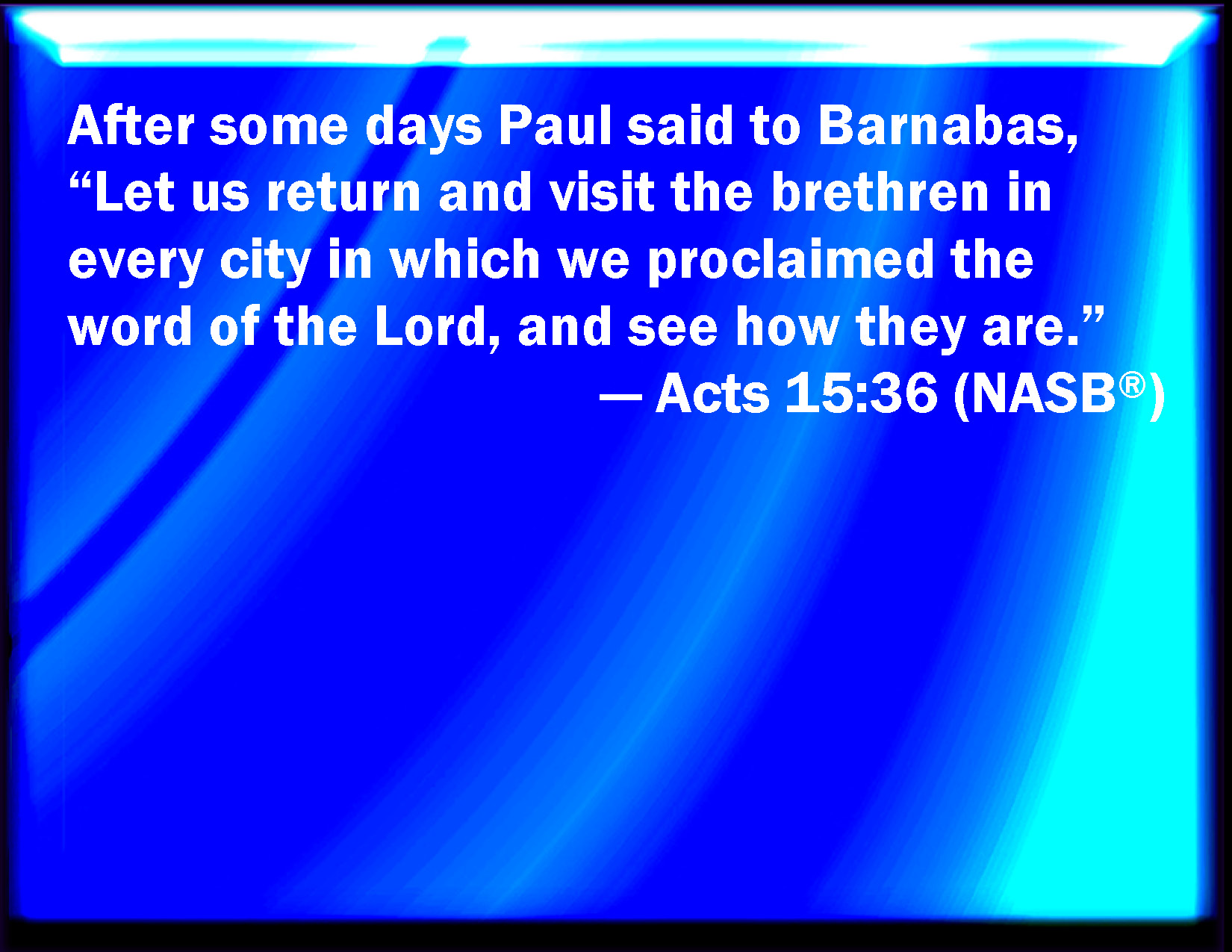 Bible Verse Slide Acts 15:36 And some days after Paul said to Barnabas, Let us go again and visit our brothers in every city where we have preached the word of the LORD, and see how they do. KJV: And some days after Paul said unto Barnabas, Let us go again and visit our brethren in every city where we have preached the word of the Lord, and see how they do. DRB: And after some days, Paul said to Barnabas: Let us return and visit our brethren in all the cities wherein we have preached the word of the Lord, to see how they do. DBT: But after certain days Paul said to Barnabas, Let us return now and visit the brethren in every city where we have announced the word of the Lord, and see how they are getting on. ERV: And after some days Paul said unto Barnabas, Let us return now and visit the brethren in every city wherein we proclaimed the word of the Lord, and see how they fare. WBT: And some days after, Paul said to Barnabas, Let us go again and visit our brethren, in every city where we have preached the word of the Lord, and see how they do. WEB: After some days Paul said to Barnabas, "Let's return now and visit our brothers in every city in which we proclaimed the word of the Lord, to see how they are doing." YLT: and after certain days, Paul said unto Barnabas, 'Having turned back again, we may look after our brethren, in every city in which we have preached the word of the Lord — how they are.'Links Acts 15:36 NIV • Acts 15:36 NLT • Acts 15:36 ESV • Acts 15:36 NASB • Acts 15:36 KJV • Acts 15:36 Interlinear • Acts 15:36 Commentaries • Acts 15:36 Parallel Texts • Acts 15:36 Bible Apps • Acts 15:36 Parallel • Bible Hub |