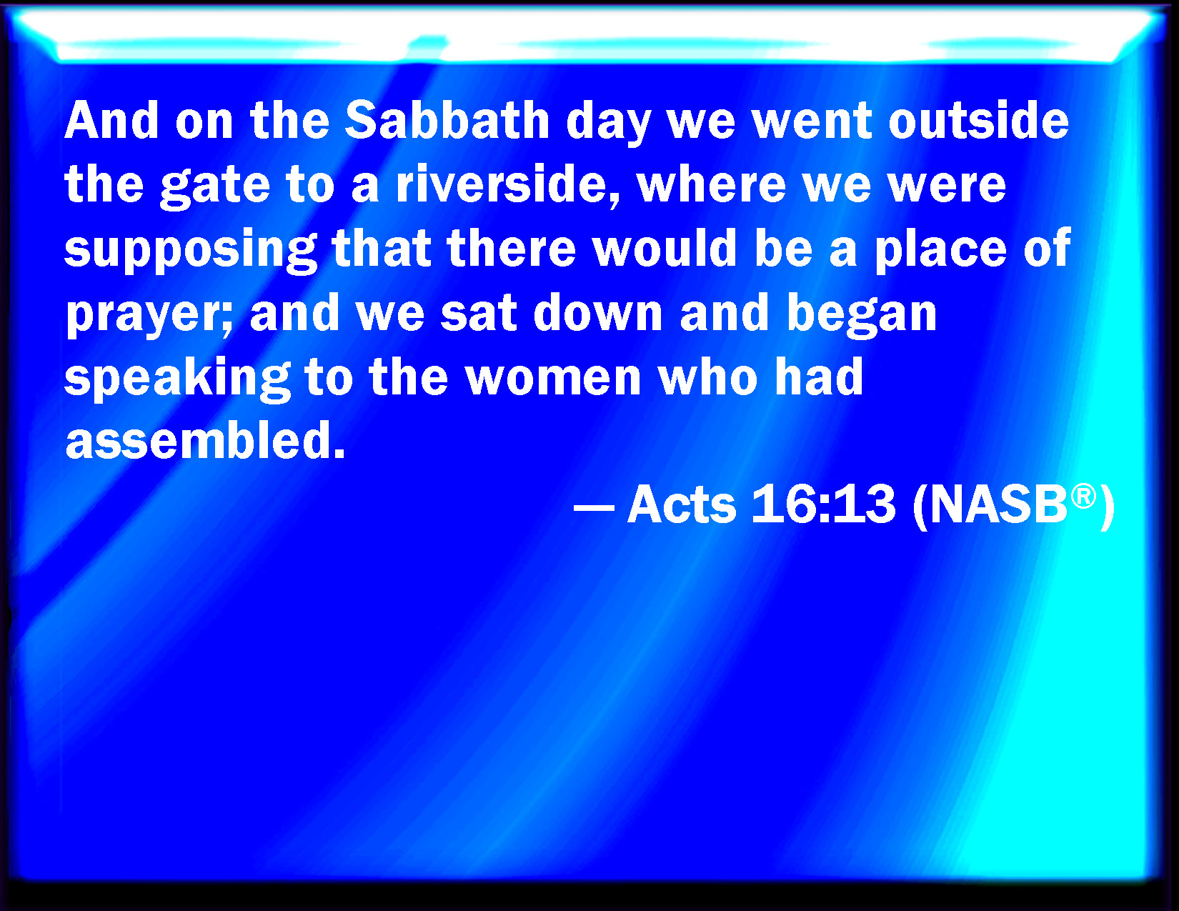Bible Verse Slide Acts 16:13 And on the sabbath we went out of the city by a river side, where prayer was wont to be made; and we sat down, and spoke to the women which resorted thither. KJV: And on the sabbath we went out of the city by a river side, where prayer was wont to be made; and we sat down, and spake unto the women which resorted thither. DRB: And upon the sabbath day, we went forth without the gate by a river side, where it seemed that there was prayer; and sitting down, we spoke to the women that were assembled. DBT: And on the sabbath day we went outside the gate by the river, where it was the custom for prayer to be, and we sat down and spoke to the women who had assembled. ERV: And on the sabbath day we went forth without the gate by a river side, where we supposed there was a place of prayer; and we sat down, and spake unto the women which were come together. WBT: And on the sabbath we went out of the city by a river side, where prayer was wont to be made; and we sat down, and spoke to the women who resorted thither. WEB: On the Sabbath day we went forth outside of the city by a riverside, where we supposed there was a place of prayer, and we sat down, and spoke to the women who had come together. YLT: on the sabbath-day also we went forth outside of the city, by a river, where there used to be prayer, and having sat down, we were speaking to the women who came together,Links Acts 16:13 NIV • Acts 16:13 NLT • Acts 16:13 ESV • Acts 16:13 NASB • Acts 16:13 KJV • Acts 16:13 Interlinear • Acts 16:13 Commentaries • Acts 16:13 Parallel Texts • Acts 16:13 Bible Apps • Acts 16:13 Parallel • Bible Hub |