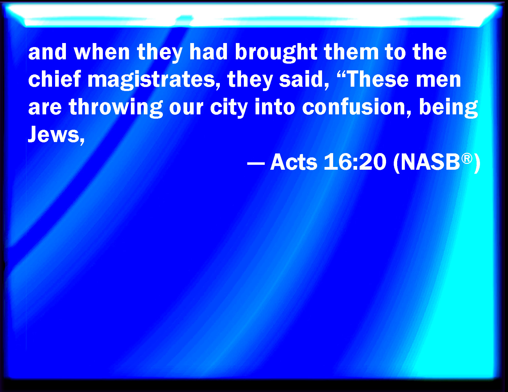 Bible Verse Slide Acts 16:20 And brought them to the magistrates, saying, These men, being Jews, do exceedingly trouble our city, KJV: And brought them to the magistrates, saying, These men, being Jews, do exceedingly trouble our city, DRB: And presenting them to the magistrates, they said: These men disturb our city, being Jews; DBT: and having brought them up to the praetors, said, These men utterly trouble our city, being Jews, ERV: and when they had brought them unto the magistrates, they said, These men, being Jews, do exceedingly trouble our city, WBT: And brought them to the magistrates, saying, These men, being Jews, do exceedingly trouble our city, WEB: When they had brought them to the magistrates, they said, "These men, being Jews, are agitating our city, YLT: and having brought them to the magistrates, they said, 'These men do exceedingly trouble our city, being Jews;Links Acts 16:20 NIV • Acts 16:20 NLT • Acts 16:20 ESV • Acts 16:20 NASB • Acts 16:20 KJV • Acts 16:20 Interlinear • Acts 16:20 Commentaries • Acts 16:20 Parallel Texts • Acts 16:20 Bible Apps • Acts 16:20 Parallel • Bible Hub |