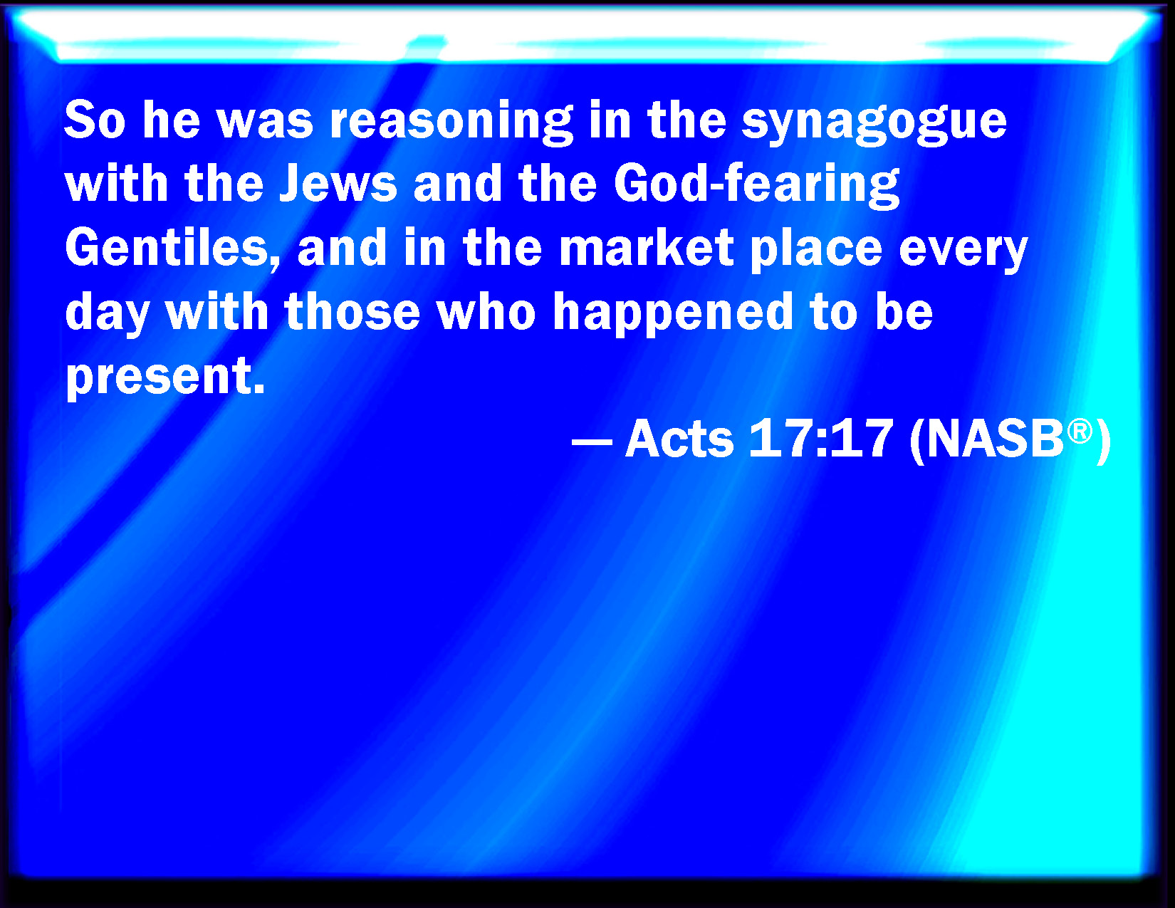 Bible Verse Slide Acts 17:17 Therefore disputed he in the synagogue with the Jews, and with the devout persons, and in the market daily with them that met with him. KJV: Therefore disputed he in the synagogue with the Jews, and with the devout persons, and in the market daily with them that met with him. DRB: He disputed, therefore, in the synagogue with the Jews, and with them that served God, and in the marketplace, every day with them that were there. DBT: He reasoned therefore in the synagogue with the Jews, and those who worshipped, and in the market-place every day with those he met with. ERV: So he reasoned in the synagogue with the Jews and the devout persons, and in the marketplace every day with them that met with him. WBT: Therefore he disputed in the synagogue with the Jews, and with the devout persons, and in the market daily with them that met with him. WEB: So he reasoned in the synagogue with the Jews and the devout persons, and in the marketplace every day with those who met him. YLT: therefore, indeed, he was reasoning in the synagogue with the Jews, and with the worshipping persons, and in the market-place every day with those who met with him.Links Acts 17:17 NIV • Acts 17:17 NLT • Acts 17:17 ESV • Acts 17:17 NASB • Acts 17:17 KJV • Acts 17:17 Interlinear • Acts 17:17 Commentaries • Acts 17:17 Parallel Texts • Acts 17:17 Bible Apps • Acts 17:17 Parallel • Bible Hub |