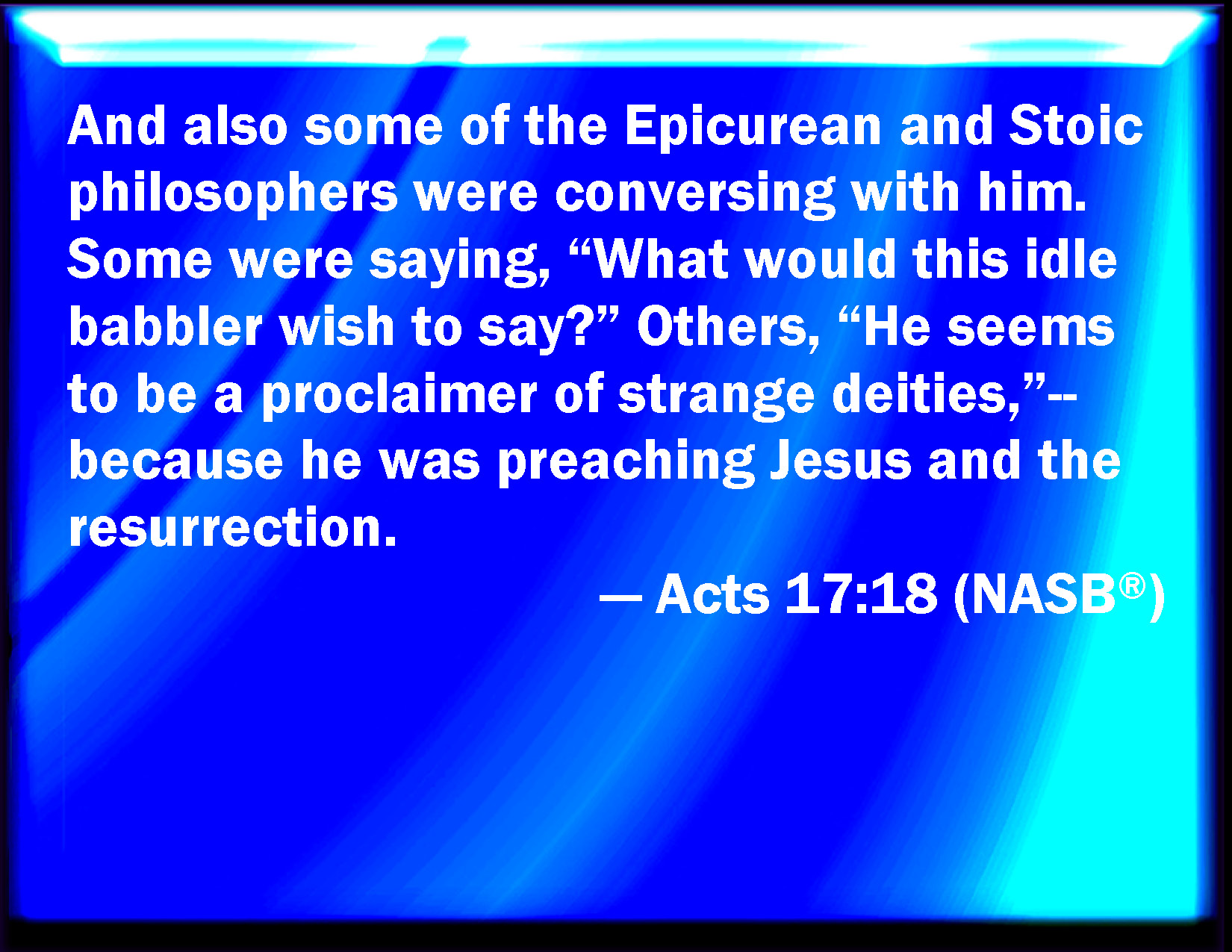 Bible Verse Slide Acts 17:18 Then certain philosophers of the Epicureans, and of the Stoicks, encountered him. And some said, What will this babbler say? other some, He seems to be a setter forth of strange gods: because he preached to them Jesus, and the resurrection. KJV: Then certain philosophers of the Epicureans, and of the Stoicks, encountered him. And some said, What will this babbler say? other some, He seemeth to be a setter forth of strange gods: because he preached unto them Jesus, and the resurrection. DRB: And certain philosophers of the Epicureans and of the Stoics disputed with him; and some said: What is it, that this word sower would say? But others: He seemeth to be a setter forth of new gods; because he preached to them Jesus and the resurrection. DBT: But some also of the Epicurean and Stoic philosophers attacked him. And some said, What would this chatterer say? and some, He seems to be an announcer of foreign demons, because he announced the glad tidings of Jesus and the resurrection to them. ERV: And certain also of the Epicurean and Stoic philosophers encountered him. And some said, What would this babbler say? other some, He seemeth to be a setter forth of strange gods: because he preached Jesus and the resurrection. WBT: Then certain philosophers of the Epicureans, and of the Stoics, encountered him. And some said, What will this babbler say? some others, He seemeth to be a setter-forth of strange gods: because he preached to them Jesus, and the resurrection. WEB: Some of the Epicurean and Stoic philosophers also were conversing with him. Some said, "What does this babbler want to say?" Others said, "He seems to be advocating foreign deities," because he preached Jesus and the resurrection. YLT: And certain of the Epicurean and of the Stoic philosophers, were meeting together to see him, and some were saying, 'What would this seed picker wish to say?' and others, 'Of strange demons he doth seem to be an announcer;' because Jesus and the rising again he did proclaim to them as good news,Links Acts 17:18 NIV • Acts 17:18 NLT • Acts 17:18 ESV • Acts 17:18 NASB • Acts 17:18 KJV • Acts 17:18 Interlinear • Acts 17:18 Commentaries • Acts 17:18 Parallel Texts • Acts 17:18 Bible Apps • Acts 17:18 Parallel • Bible Hub |