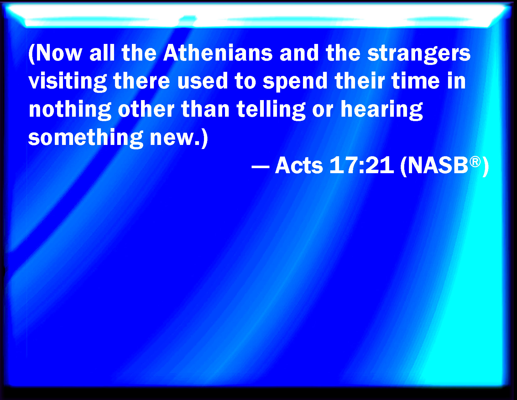 Bible Verse Slide Acts 17:21 (For all the Athenians and strangers which were there spent their time in nothing else, but either to tell, or to hear some new thing.) KJV: (For all the Athenians and strangers which were there spent their time in nothing else, but either to tell, or to hear some new thing.) DRB: (Now all the Athenians, and strangers that were there, employed themselves in nothing else, but either in telling or in hearing some new thing.) DBT: Now all the Athenians and the strangers sojourning there spent their time in nothing else than to tell and to hear the news. ERV: (Now all the Athenians and the strangers sojourning there spent their time in nothing else, but either to tell or to hear some new thing.) WBT: (For all the Athenians and strangers who were there, spent their time in nothing else, but either to tell, or to hear some new thing.) WEB: Now all the Athenians and the strangers living there spent their time in nothing else, but either to tell or to hear some new thing. YLT: and all Athenians, and the strangers sojourning, for nothing else were at leisure but to say something, and to hear some newer thing.Links Acts 17:21 NIV • Acts 17:21 NLT • Acts 17:21 ESV • Acts 17:21 NASB • Acts 17:21 KJV • Acts 17:21 Interlinear • Acts 17:21 Commentaries • Acts 17:21 Parallel Texts • Acts 17:21 Bible Apps • Acts 17:21 Parallel • Bible Hub |