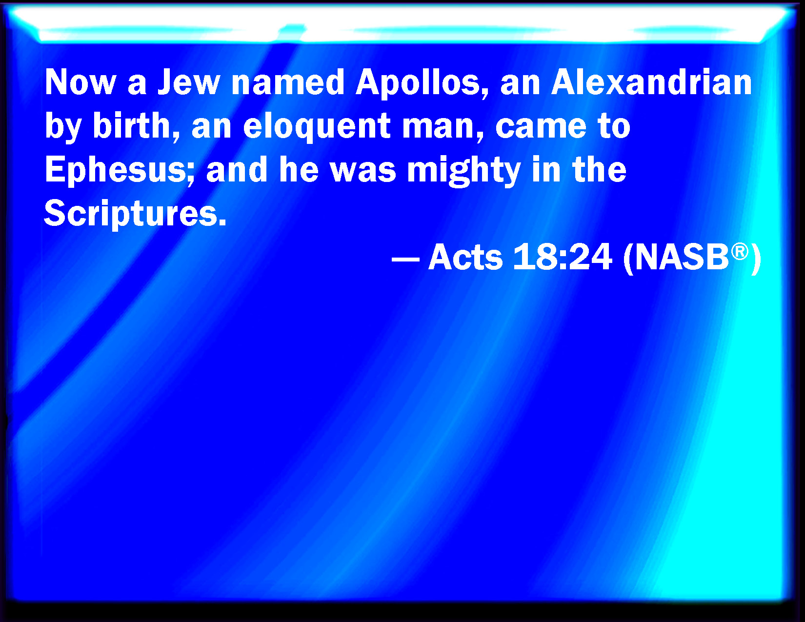 Bible Verse Slide Acts 18:24 And a certain Jew named Apollos, born at Alexandria, an eloquent man, and mighty in the scriptures, came to Ephesus. KJV: And a certain Jew named Apollos, born at Alexandria, an eloquent man, and mighty in the scriptures, came to Ephesus. DRB: Now a certain Jew, named Apollo, born at Alexandria, an eloquent man, came to Ephesus, one mighty in the scriptures. DBT: But a certain Jew, Apollos by name, an Alexandrian by race, an eloquent man, who was mighty in the scriptures, arrived at Ephesus. ERV: Now a certain Jew named Apollos, an Alexandrian by race, a learned man, came to Ephesus; and he was mighty in the scriptures. WBT: And a certain Jew named Apollos, born at Alexandria, an eloquent man, and mighty in the scriptures, came to Ephesus. WEB: Now a certain Jew named Apollos, an Alexandrian by race, an eloquent man, came to Ephesus. He was mighty in the Scriptures. YLT: And a certain Jew, Apollos by name, an Alexandrian by birth, a man of eloquence, being mighty in the Writings, came to Ephesus,Links Acts 18:24 NIV • Acts 18:24 NLT • Acts 18:24 ESV • Acts 18:24 NASB • Acts 18:24 KJV • Acts 18:24 Interlinear • Acts 18:24 Commentaries • Acts 18:24 Parallel Texts • Acts 18:24 Bible Apps • Acts 18:24 Parallel • Bible Hub |