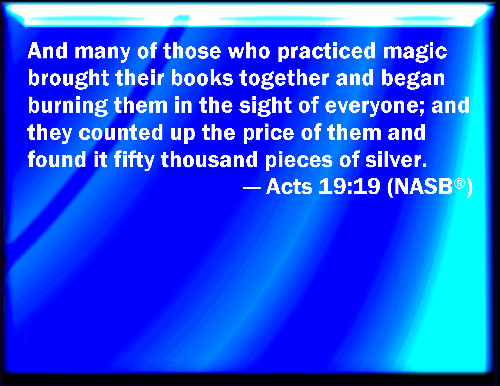 Bible Verse Slide Acts 19:19 Many of them also which used curious arts brought their books together, and burned them before all men: and they counted the price of them, and found it fifty thousand pieces of silver. KJV: Many of them also which used curious arts brought their books together, and burned them before all men: and they counted the price of them, and found it fifty thousand pieces of silver. DRB: And many of them who had followed curious arts, brought together their books, and burnt them before all; and counting the price of them, they found the money to be fifty thousand pieces of silver. DBT: And many of those that practised curious arts brought their books of charms and burnt them before all. And they reckoned up the prices of them, and found it fifty thousand pieces of silver. ERV: And not a few of them that practised curious arts brought their books together, and burned them in the sight of all: and they counted the price of them, and found it fifty thousand pieces of silver. WBT: Many also of them who used curious arts, brought their books together, and burned them before all men; and they counted the price of them, and found it fifty thousand pieces of silver. WEB: Many of those who practiced magical arts brought their books together and burned them in the sight of all. They counted the price of them, and found it to be fifty thousand pieces of silver. YLT: and many of those who had practised the curious arts, having brought the books together, were burning them before all; and they reckoned together the prices of them, and found it five myriads of silverlings;Links Acts 19:19 NIV • Acts 19:19 NLT • Acts 19:19 ESV • Acts 19:19 NASB • Acts 19:19 KJV • Acts 19:19 Interlinear • Acts 19:19 Commentaries • Acts 19:19 Parallel Texts • Acts 19:19 Bible Apps • Acts 19:19 Parallel • Bible Hub |