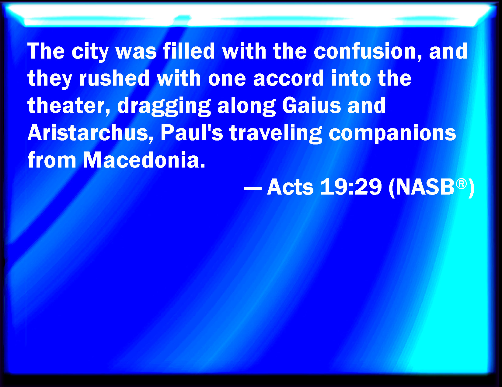 Bible Verse Slide Acts 19:29 And the whole city was filled with confusion: and having caught Gaius and Aristarchus, men of Macedonia, Paul's companions in travel, they rushed with one accord into the theatre. KJV: And the whole city was filled with confusion: and having caught Gaius and Aristarchus, men of Macedonia, Paul's companions in travel, they rushed with one accord into the theatre. DRB: And the whole city was filled with confusion; and having caught Gaius and Aristarchus, men of Macedonia, Paul's companions, they rushed with one accord into the theatre. DBT: And the whole city was filled with confusion, and they rushed with one accord to the theatre, having seized and carried off with them Gaius and Aristarchus, Macedonians, fellow-travellers of Paul. ERV: And the city was filled with the confusion: and they rushed with one accord into the theatre, having seized Gaius and Aristarchus, men of Macedonia, Paul's companions in travel. WBT: And the whole city was filled with confusion: and having caught Gaius and Aristarchus, men of Macedonia, Paul's companions in travel, they rushed with one accord into the theater. WEB: The whole city was filled with confusion, and they rushed with one accord into the theater, having seized Gaius and Aristarchus, men of Macedonia, Paul's companions in travel. YLT: and the whole city was filled with confusion, they rushed also with one accord into the theatre, having caught Gaius and Aristarchus, Macedonians, Paul's fellow-travellers.Links Acts 19:29 NIV • Acts 19:29 NLT • Acts 19:29 ESV • Acts 19:29 NASB • Acts 19:29 KJV • Acts 19:29 Interlinear • Acts 19:29 Commentaries • Acts 19:29 Parallel Texts • Acts 19:29 Bible Apps • Acts 19:29 Parallel • Bible Hub |