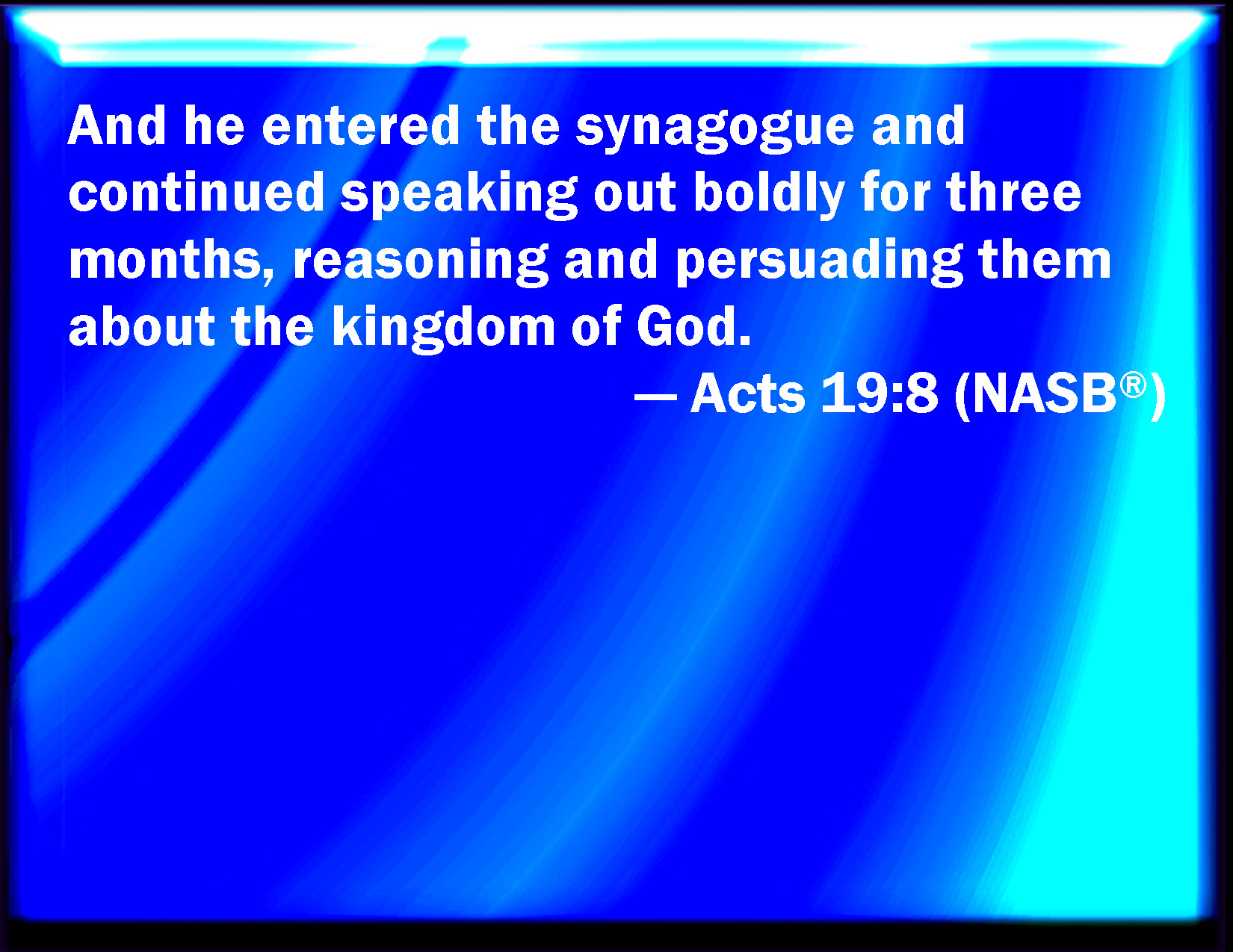 Bible Verse Slide Acts 19:8 And he went into the synagogue, and spoke boldly for the space of three months, disputing and persuading the things concerning the kingdom of God. KJV: And he went into the synagogue, and spake boldly for the space of three months, disputing and persuading the things concerning the kingdom of God. DRB: And entering into the synagogue, he spoke boldly for the space of three months, disputing and exhorting concerning the kingdom of God. DBT: And entering into the synagogue, he spoke boldly during three months, reasoning and persuading the things concerning the kingdom of God. ERV: And he entered into the synagogue, and spake boldly for the space of three months, reasoning and persuading as to the things concerning the kingdom of God. WBT: And he went into the synagogue, and spoke boldly for the space of three months, disputing and persuading the things concerning the kingdom of God. WEB: He entered into the synagogue, and spoke boldly for a period of three months, reasoning and persuading about the things concerning the Kingdom of God. YLT: And having gone into the synagogue, he was speaking boldly for three months, reasoning and persuading the things concerning the reign of God,Links Acts 19:8 NIV • Acts 19:8 NLT • Acts 19:8 ESV • Acts 19:8 NASB • Acts 19:8 KJV • Acts 19:8 Interlinear • Acts 19:8 Commentaries • Acts 19:8 Parallel Texts • Acts 19:8 Bible Apps • Acts 19:8 Parallel • Bible Hub |