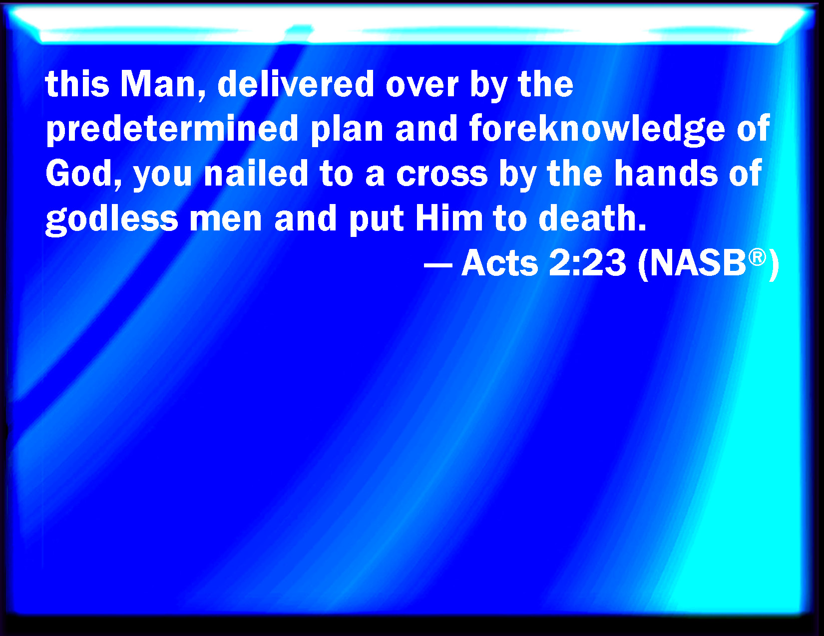 Bible Verse Slide Acts 2:23 Him, being delivered by the determinate counsel and foreknowledge of God, you have taken, and by wicked hands have crucified and slain: KJV: Him, being delivered by the determinate counsel and foreknowledge of God, ye have taken, and by wicked hands have crucified and slain: DRB: This same being delivered up, by the determinate counsel and foreknowledge of God, you by the hands of wicked men have crucified and slain. DBT: him, given up by the determinate counsel and foreknowledge of God, ye, by the hand of lawless men, have crucified and slain. ERV: him, being delivered up by the determinate counsel and foreknowledge of God, ye by the hand of lawless men did crucify and slay: WBT: Him, being delivered by the determinate counsel and foreknowledge of God, ye have taken, and by wicked hands have crucified and slain: WEB: him, being delivered up by the determined counsel and foreknowledge of God, you have taken by the hand of lawless men, crucified and killed; YLT: this one, by the determinate counsel and foreknowledge of God, being given out, having taken by lawless hands, having crucified — ye did slay;Links Acts 2:23 NIV • Acts 2:23 NLT • Acts 2:23 ESV • Acts 2:23 NASB • Acts 2:23 KJV • Acts 2:23 Interlinear • Acts 2:23 Commentaries • Acts 2:23 Parallel Texts • Acts 2:23 Bible Apps • Acts 2:23 Parallel • Bible Hub |