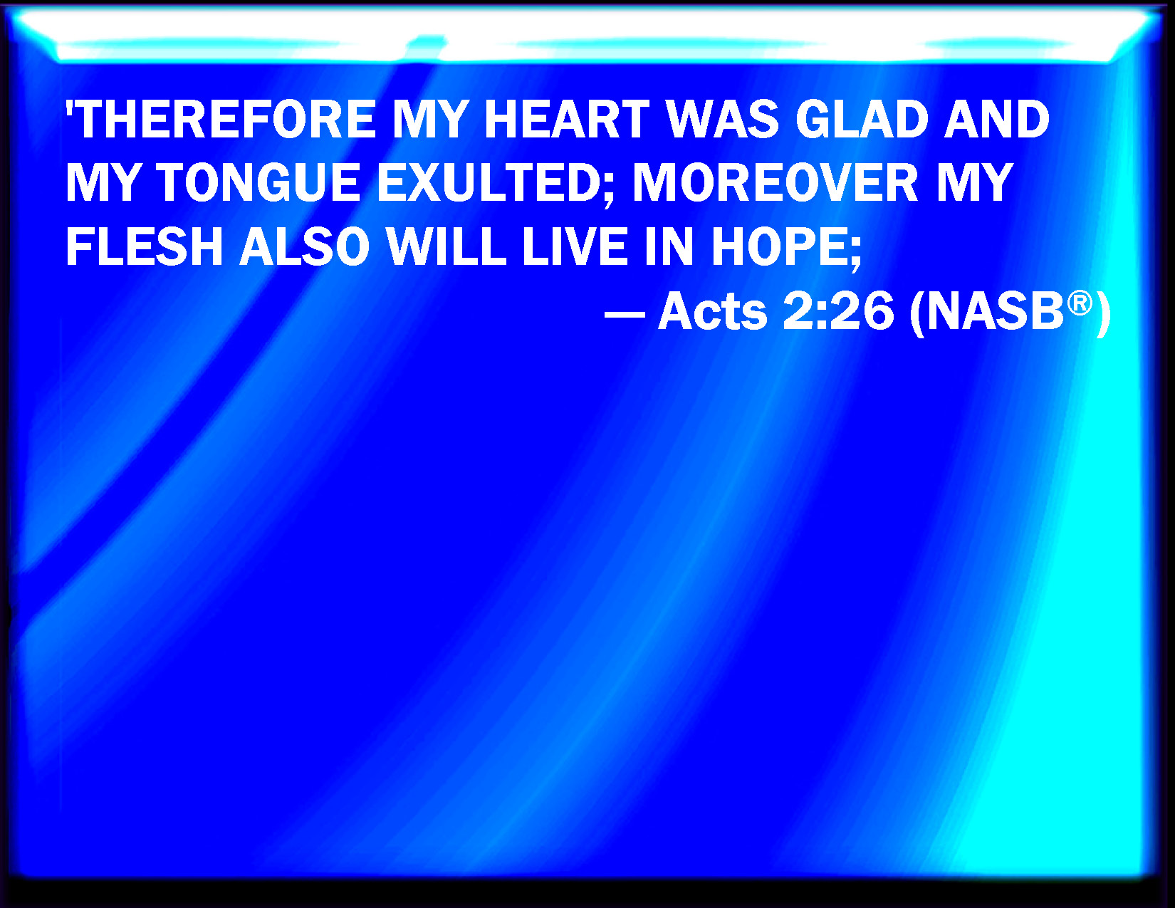 Bible Verse Slide Acts 2:26 Therefore did my heart rejoice, and my tongue was glad; moreover also my flesh shall rest in hope: KJV: Therefore did my heart rejoice, and my tongue was glad; moreover also my flesh shall rest in hope: DRB: For this my heart hath been glad, and any tongue hath rejoiced: moreover my flesh also shall rest in hope. DBT: Therefore has my heart rejoiced and my tongue exulted; yea more, my flesh also shall dwell in hope, ERV: Therefore my heart was glad, and my tongue rejoiced; Moreover my flesh also shall dwell in hope: WBT: Therefore did my heart rejoice, and my tongue was glad; moreover also, my flesh shall rest in hope: WEB: Therefore my heart was glad, and my tongue rejoiced. Moreover my flesh also will dwell in hope; YLT: because of this was my heart cheered, and my tongue was glad, and yet — my flesh also shall rest on hope,Links Acts 2:26 NIV • Acts 2:26 NLT • Acts 2:26 ESV • Acts 2:26 NASB • Acts 2:26 KJV • Acts 2:26 Interlinear • Acts 2:26 Commentaries • Acts 2:26 Parallel Texts • Acts 2:26 Bible Apps • Acts 2:26 Parallel • Bible Hub |