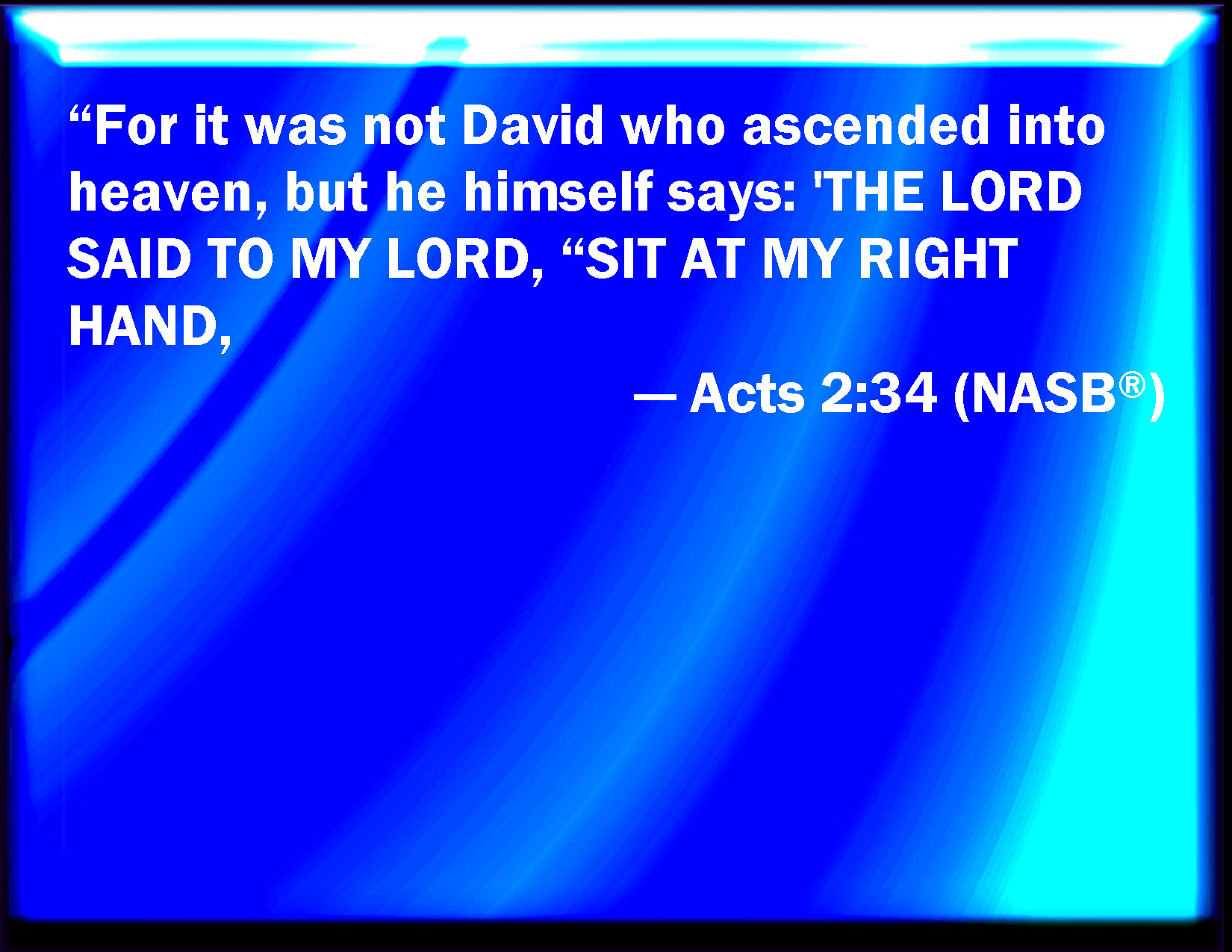 Bible Verse Slide Acts 2:34 For David is not ascended into the heavens: but he said himself, The Lord said to my Lord, Sit you on my right hand, KJV: For David is not ascended into the heavens: but he saith himself, The LORD said unto my Lord, Sit thou on my right hand, DRB: For David ascended not into heaven; but he himself said: The Lord said to my Lord, sit thou on my right hand, DBT: For David has not ascended into the heavens, but he says himself, The Lord said unto my Lord, Sit at my right hand ERV: For David ascended not into the heavens: but he saith himself, The Lord said unto my Lord, Sit thou on my right hand, WBT: For David did not ascend into the heavens, but he saith himself, The LORD said to my Lord, Sit thou on my right hand, WEB: For David didn't ascend into the heavens, but he says himself, 'The Lord said to my Lord, "Sit by my right hand, YLT: for David did not go up to the heavens, and he saith himself: The Lord saith to my lord, Sit thou at my right hand,Links Acts 2:34 NIV • Acts 2:34 NLT • Acts 2:34 ESV • Acts 2:34 NASB • Acts 2:34 KJV • Acts 2:34 Interlinear • Acts 2:34 Commentaries • Acts 2:34 Parallel Texts • Acts 2:34 Bible Apps • Acts 2:34 Parallel • Bible Hub |