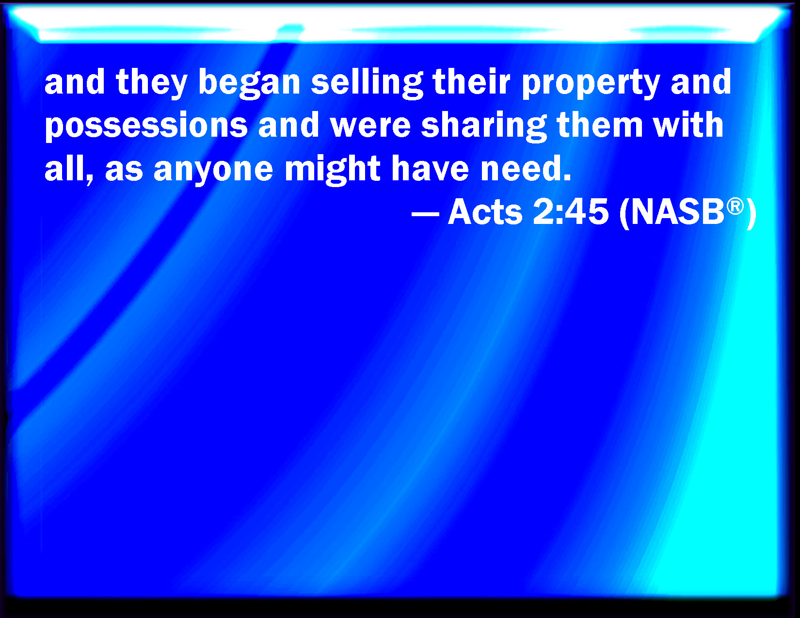 Bible Verse Slide Acts 2:45 And sold their possessions and goods, and parted them to all men, as every man had need. KJV: And sold their possessions and goods, and parted them to all men, as every man had need. DRB: Their possessions and goods they sold, and divided them to all, according as every one had need. DBT: and sold their possessions and substance, and distributed them to all, according as any one might have need. ERV: and they sold their possessions and goods, and parted them to all, according as any man had need. WBT: And sold their possessions and goods, and parted them to all men, as every man had need. WEB: They sold their possessions and goods, and distributed them to all, according as anyone had need. YLT: and the possessions and the goods they were selling, and were parting them to all, according as any one had need.Links Acts 2:45 NIV • Acts 2:45 NLT • Acts 2:45 ESV • Acts 2:45 NASB • Acts 2:45 KJV • Acts 2:45 Interlinear • Acts 2:45 Commentaries • Acts 2:45 Parallel Texts • Acts 2:45 Bible Apps • Acts 2:45 Parallel • Bible Hub |