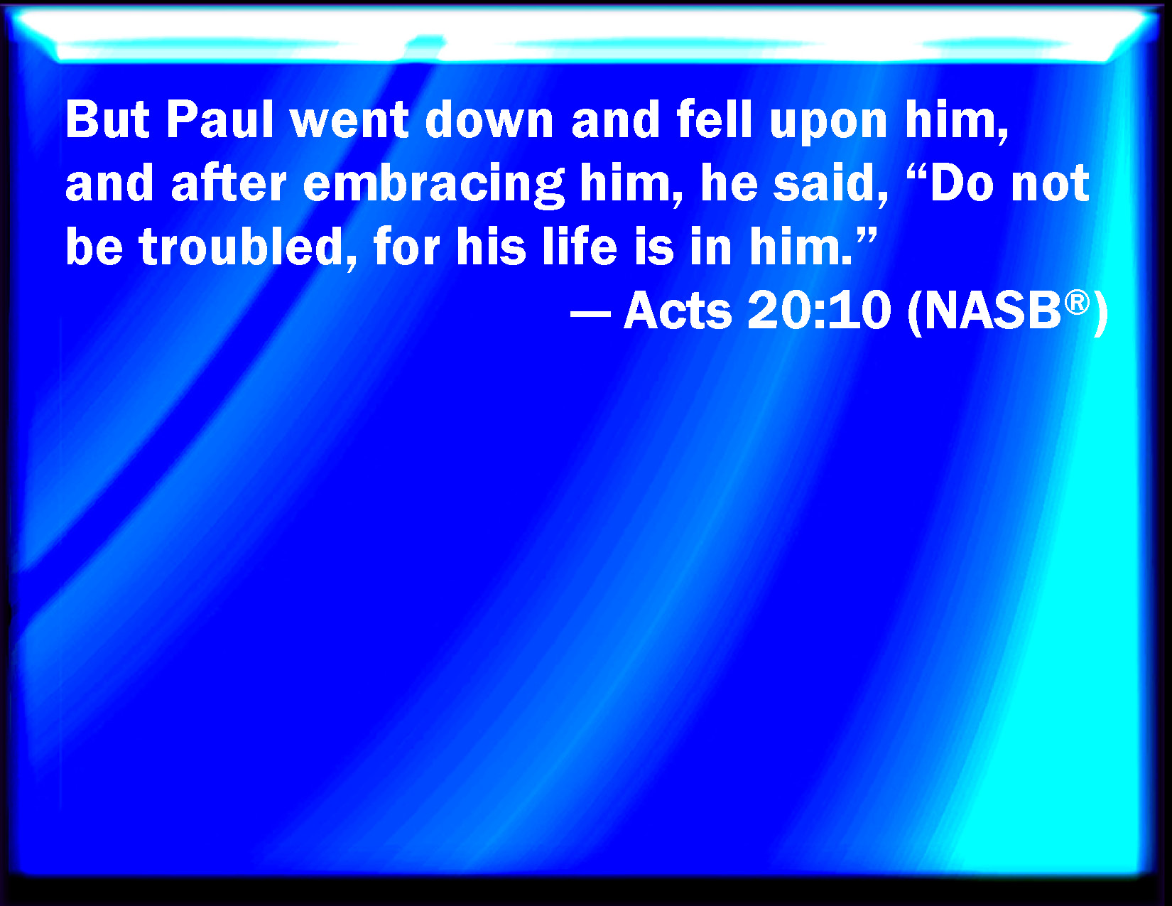 Bible Verse Slide Acts 20:10 And Paul went down, and fell on him, and embracing him said, Trouble not yourselves; for his life is in him. KJV: And Paul went down, and fell on him, and embracing him said, Trouble not yourselves; for his life is in him. DRB: To whom, when Paul had gone down, he laid himself upon him, and embracing him, said: Be not troubled, for his soul is in him. DBT: But Paul descending fell upon him, and enfolding him in his arms, said, Be not troubled, for his life is in him. ERV: And Paul went down, and fell on him, and embracing him said, Make ye no ado; for his life is in him. WBT: And Paul went down, and fell on him, and embracing him, said, Trouble not yourselves; for his life is in him. WEB: Paul went down, and fell upon him, and embracing him said, "Don't be troubled, for his life is in him." YLT: And Paul, having gone down, fell upon him, and having embraced him, said, 'Make no tumult, for his life is in him;'Links Acts 20:10 NIV • Acts 20:10 NLT • Acts 20:10 ESV • Acts 20:10 NASB • Acts 20:10 KJV • Acts 20:10 Interlinear • Acts 20:10 Commentaries • Acts 20:10 Parallel Texts • Acts 20:10 Bible Apps • Acts 20:10 Parallel • Bible Hub |