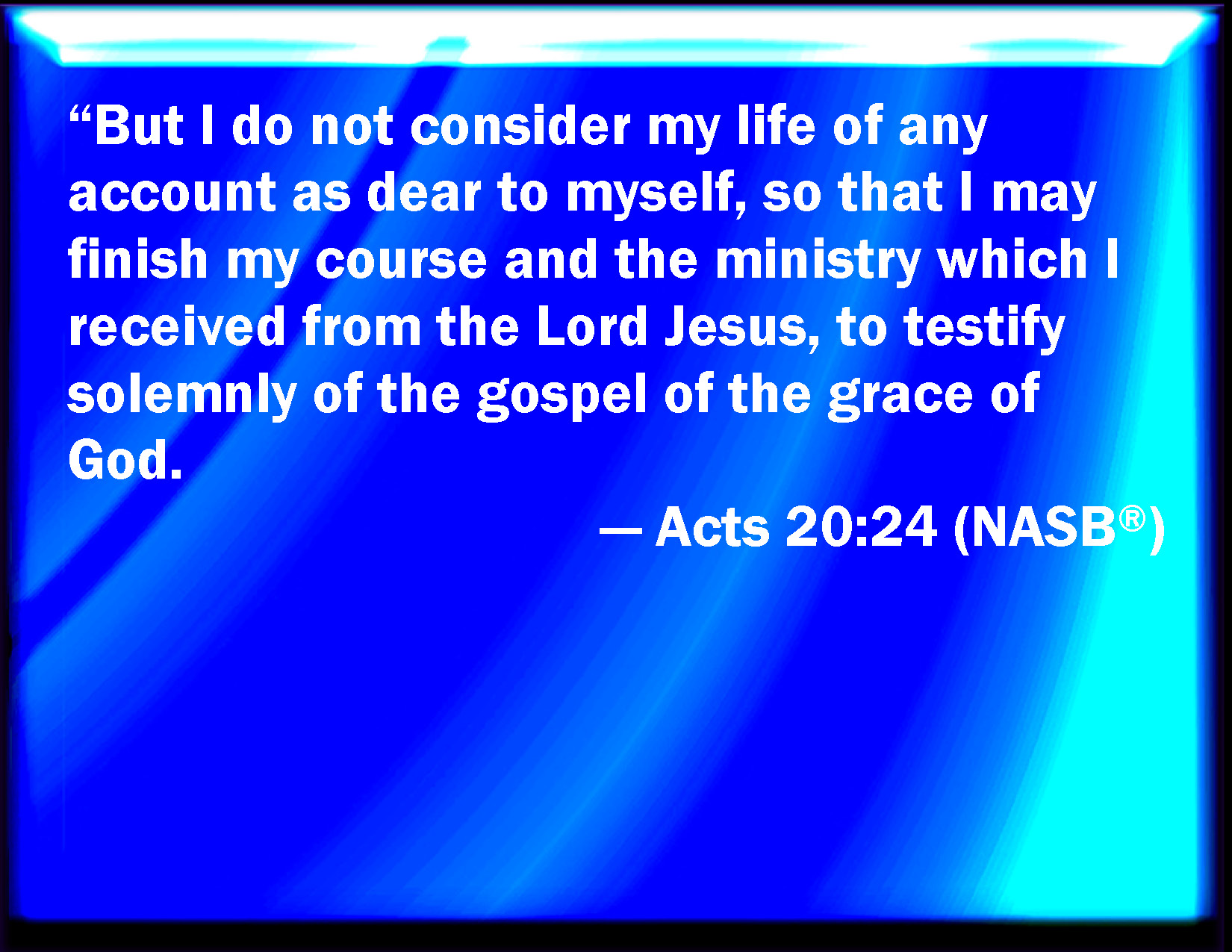 Bible Verse Slide Acts 20:24 But none of these things move me, neither count I my life dear to myself, so that I might finish my course with joy, and the ministry, which I have received of the Lord Jesus, to testify the gospel of the grace of God. KJV: But none of these things move me, neither count I my life dear unto myself, so that I might finish my course with joy, and the ministry, which I have received of the Lord Jesus, to testify the gospel of the grace of God. DRB: But I fear none of these things, neither do I count my life more precious than myself, so that I may consummate my course and the ministry of the word which I received from the Lord Jesus, to testify the gospel of the grace of God. DBT: But I make no account of my life as dear to myself, so that I finish my course, and the ministry which I have received of the Lord Jesus, to testify the glad tidings of the grace of God. ERV: But I hold not my life of any account, as dear unto myself, so that I may accomplish my course, and the ministry which I received from the Lord Jesus, to testify the gospel of the grace of God. WBT: But none of these things move me, neither count I my life dear to myself, so that I may finish my course with joy, and the ministry which I have received from the Lord Jesus, to testify the gospel of the grace of God. WEB: But these things don't count; nor do I hold my life dear to myself, so that I may finish my race with joy, and the ministry which I received from the Lord Jesus, to fully testify to the Good News of the grace of God. YLT: but I make account of none of these, neither do I count my life precious to myself, so that I finish my course with joy, and the ministration that I received from the Lord Jesus, to testify fully the good news of the grace of God.Links Acts 20:24 NIV • Acts 20:24 NLT • Acts 20:24 ESV • Acts 20:24 NASB • Acts 20:24 KJV • Acts 20:24 Interlinear • Acts 20:24 Commentaries • Acts 20:24 Parallel Texts • Acts 20:24 Bible Apps • Acts 20:24 Parallel • Bible Hub |