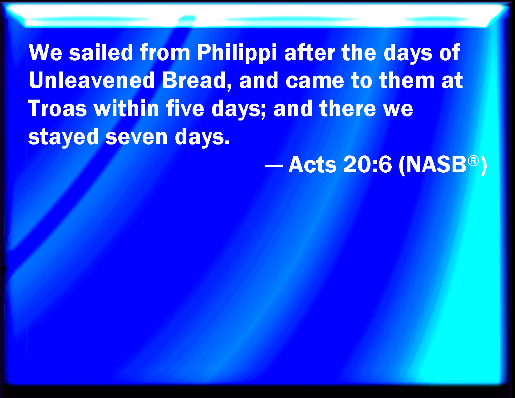 Bible Verse Slide Acts 20:6 And we sailed away from Philippi after the days of unleavened bread, and came to them to Troas in five days; where we stayed seven days. KJV: And we sailed away from Philippi after the days of unleavened bread, and came unto them to Troas in five days; where we abode seven days. DRB: But we sailed from Philippi after the days of the Azymes, and came to them to Troas in five days, where we abode seven days. DBT: but we sailed away from Philippi after the days of unleavened bread, and we came to them to Troas in five days, where we spent seven days. ERV: And we sailed away from Philippi after the days of unleavened bread, and came unto them to Troas in five days; where we tarried seven days. WBT: And we sailed away from Philippi, after the days of unleavened bread, and came to them to Troas in five days; where we abode seven days. WEB: We sailed away from Philippi after the days of Unleavened Bread, and came to them at Troas in five days, where we stayed seven days. YLT: and we sailed, after the days of the unleavened food, from Philippi, and came unto them to Troas in five days, where we abode seven days.Links Acts 20:6 NIV • Acts 20:6 NLT • Acts 20:6 ESV • Acts 20:6 NASB • Acts 20:6 KJV • Acts 20:6 Interlinear • Acts 20:6 Commentaries • Acts 20:6 Parallel Texts • Acts 20:6 Bible Apps • Acts 20:6 Parallel • Bible Hub |