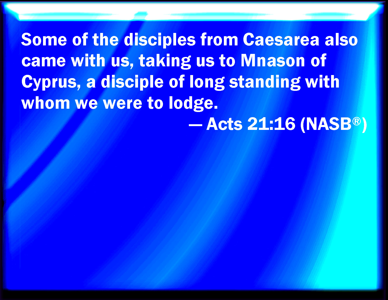 Bible Verse Slide Acts 21:16 There went with us also certain of the disciples of Caesarea, and brought with them one Mnason of Cyprus, an old disciple, with whom we should lodge. KJV: There went with us also certain of the disciples of Caesarea, and brought with them one Mnason of Cyprus, an old disciple, with whom we should lodge. DRB: And there went also with us some of the disciples from Caesarea, bringing with them one Mnason a Cyprian, an old disciple, with whom we should lodge. DBT: And some of the disciples from Caesarea went with us, bringing with them a certain Mnason, a Cyprian, an old disciple, with whom we were to lodge. ERV: And there went with us also certain of the disciples from Caesarea, bringing with them one Mnason of Cyprus, an early disciple, with whom we should lodge. WBT: There went with us also certain of the disciples of Cesarea, and brought with them one Mnason of Cyprus, an old disciple, with whom we should lodge. WEB: Some of the disciples from Caesarea also went with us, bringing one Mnason of Cyprus, an early disciple, with whom we would stay. YLT: and there went also of the disciples from Caesarea with us, bringing with them him with whom we may lodge, a certain Mnason of Cyprus, an aged disciple.Links Acts 21:16 NIV • Acts 21:16 NLT • Acts 21:16 ESV • Acts 21:16 NASB • Acts 21:16 KJV • Acts 21:16 Interlinear • Acts 21:16 Commentaries • Acts 21:16 Parallel Texts • Acts 21:16 Bible Apps • Acts 21:16 Parallel • Bible Hub |