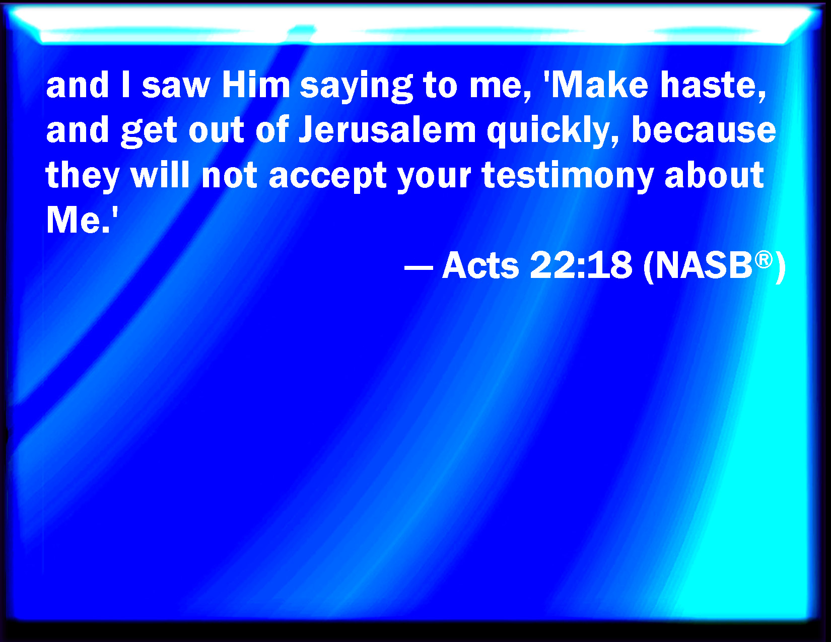 Bible Verse Slide Acts 22:18 And saw him saying to me, Make haste, and get you quickly out of Jerusalem: for they will not receive your testimony concerning me. KJV: And saw him saying unto me, Make haste, and get thee quickly out of Jerusalem: for they will not receive thy testimony concerning me. DRB: And saw him saying unto me: Make haste, and get thee quickly out of Jerusalem; because they will not receive thy testimony concerning me. DBT: and saw him saying to me, Make haste and go quickly out of Jerusalem, for they will not receive thy testimony concerning me. ERV: and saw him saying unto me, Make haste, and get thee quickly out of Jerusalem: because they will not receive of thee testimony concerning me. WBT: And saw him saying to me, Make haste, and depart quickly from Jerusalem; for they will not receive thy testimony concerning me. WEB: and saw him saying to me, 'Hurry and get out of Jerusalem quickly, because they will not receive testimony concerning me from you.' YLT: and I saw him saying to me, Haste and go forth in haste out of Jerusalem, because they will not receive thy testimony concerning me;Links Acts 22:18 NIV • Acts 22:18 NLT • Acts 22:18 ESV • Acts 22:18 NASB • Acts 22:18 KJV • Acts 22:18 Interlinear • Acts 22:18 Commentaries • Acts 22:18 Parallel Texts • Acts 22:18 Bible Apps • Acts 22:18 Parallel • Bible Hub |