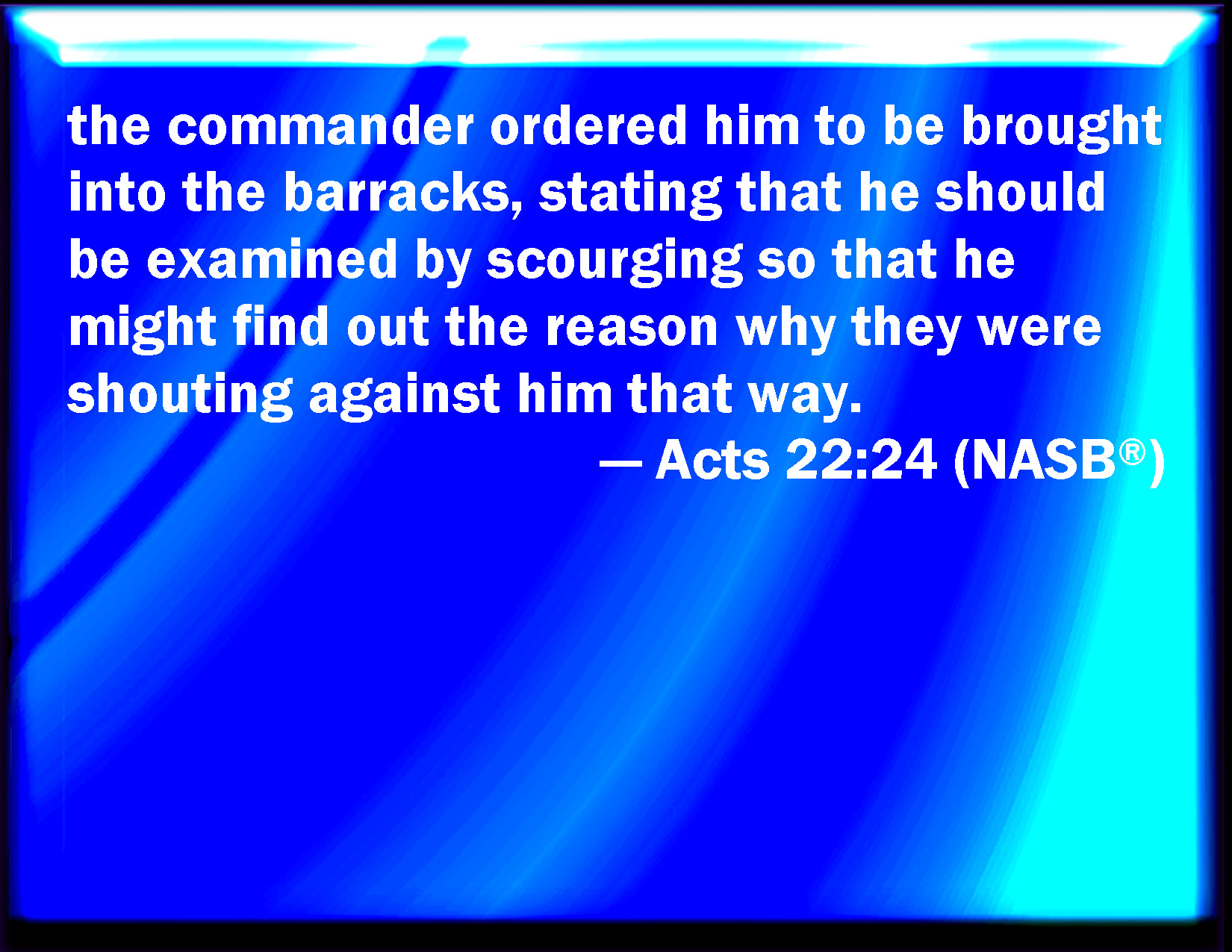 Bible Verse Slide Acts 22:24 The chief captain commanded him to be brought into the castle, and bade that he should be examined by scourging; that he might know why they cried so against him. KJV: The chief captain commanded him to be brought into the castle, and bade that he should be examined by scourging; that he might know wherefore they cried so against him. DRB: The tribune commanded him to be brought into the castle, and that he should be scourged and tortured: to know for what cause they did so cry out against him. DBT: the chiliarch commanded him to be brought into the fortress, saying that he should be examined by scourging, that he might ascertain for what cause they cried thus against him. ERV: the chief captain commanded him to be brought into the castle, bidding that he should be examined by scourging, that he might know for what cause they so shouted against him. WBT: The chief captain commanded him to be brought into the castle, and bade that he should be examined by scourging; that he might know for what cause they cried so against him. WEB: the commanding officer commanded him to be brought into the barracks, ordering him to be examined by scourging, that he might know for what crime they shouted against him like that. YLT: the chief captain commanded him to be brought into the castle, saying, 'By scourges let him be examined;' that he might know for what cause they were crying so against him.Links Acts 22:24 NIV • Acts 22:24 NLT • Acts 22:24 ESV • Acts 22:24 NASB • Acts 22:24 KJV • Acts 22:24 Interlinear • Acts 22:24 Commentaries • Acts 22:24 Parallel Texts • Acts 22:24 Bible Apps • Acts 22:24 Parallel • Bible Hub |