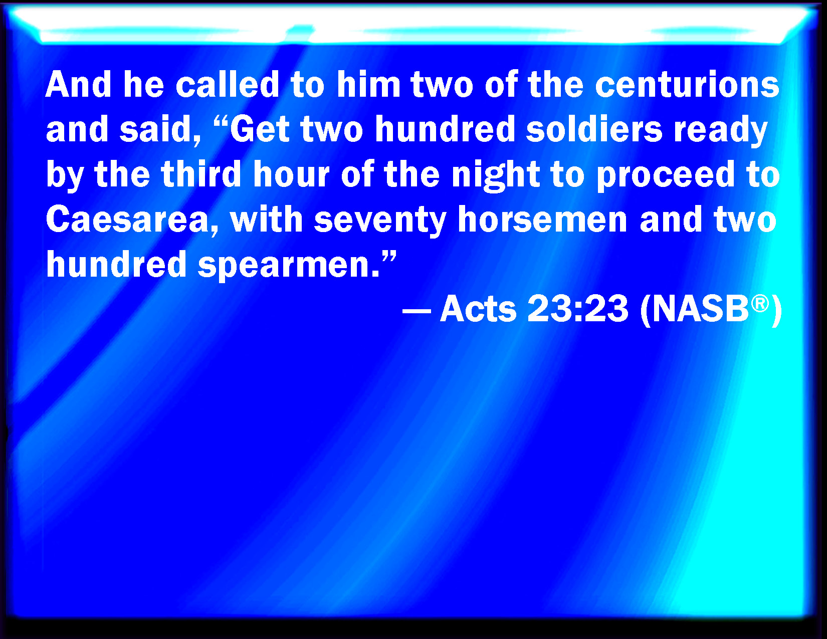 Bible Verse Slide Acts 23:23 And he called to him two centurions, saying, Make ready two hundred soldiers to go to Caesarea, and horsemen three score and ten, and spearmen two hundred, at the third hour of the night; KJV: And he called unto him two centurions, saying, Make ready two hundred soldiers to go to Caesarea, and horsemen threescore and ten, and spearmen two hundred, at the third hour of the night; DRB: Then having called two centurions, he said to them: Make ready two hundred soldiers to go as far as Caesarea, and seventy horsemen, and two hundred spearmen for the third hour of the night: DBT: And having called to him certain two of the centurions, he said, Prepare two hundred soldiers that they may go as far as Caesarea, and seventy horsemen, and two hundred light-armed footmen, for the third hour of the night. ERV: And he called unto him two of the centurions, and said, Make ready two hundred soldiers to go as far as Caesarea, and horsemen threescore and ten, and spearmen two hundred, at the third hour of the night: WBT: And he called to him two centurions, saying, Make ready two hundred soldiers to go to Cesarea, and seventy horsemen, and spearmen two hundred, at the third hour of the night; WEB: He called to himself two of the centurions, and said, "Prepare two hundred soldiers to go as far as Caesarea, with seventy horsemen, and two hundred men armed with spears, at the third hour of the night." YLT: and having called near a certain two of the centurions, he said, 'Make ready soldiers two hundred, that they may go on unto Caesarea, and horsemen seventy, and spearmen two hundred, from the third hour of the night;Links Acts 23:23 NIV • Acts 23:23 NLT • Acts 23:23 ESV • Acts 23:23 NASB • Acts 23:23 KJV • Acts 23:23 Interlinear • Acts 23:23 Commentaries • Acts 23:23 Parallel Texts • Acts 23:23 Bible Apps • Acts 23:23 Parallel • Bible Hub |