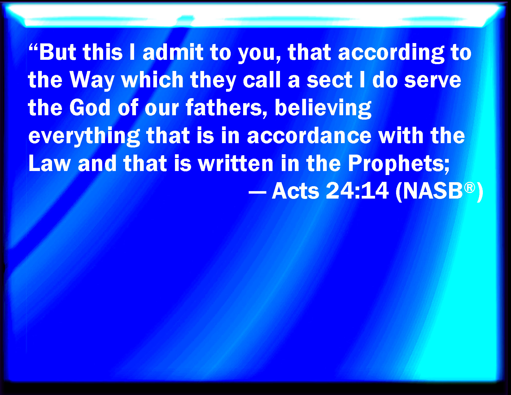 Bible Verse Slide Acts 24:14 But this I confess to you, that after the way which they call heresy, so worship I the God of my fathers, believing all things which are written in the law and in the prophets: KJV: But this I confess unto thee, that after the way which they call heresy, so worship I the God of my fathers, believing all things which are written in the law and in the prophets: DRB: But this I confess to thee, that according to the way, which they call a heresy, so do I serve the Father and my God, believing all things which are written in the law and the prophets: DBT: But this I avow to thee, that in the way which they call sect, so I serve my fathers' God, believing all things which are written throughout the law, and in the prophets; ERV: But this I confess unto thee, that after the Way which they call a sect, so serve I the God of our fathers, believing all things which are according to the law, and which are written in the prophets: WBT: But this I confess to thee, that after the way which they call heresy, so I worship the God of my fathers, believing all things which are written in the law and in the prophets: WEB: But this I confess to you, that after the Way, which they call a sect, so I serve the God of our fathers, believing all things which are according to the law, and which are written in the prophets; YLT: 'And I confess this to thee, that, according to the way that they call a sect, so serve I the God of the fathers, believing all things that in the law and the prophets have been written,Links Acts 24:14 NIV • Acts 24:14 NLT • Acts 24:14 ESV • Acts 24:14 NASB • Acts 24:14 KJV • Acts 24:14 Interlinear • Acts 24:14 Commentaries • Acts 24:14 Parallel Texts • Acts 24:14 Bible Apps • Acts 24:14 Parallel • Bible Hub |