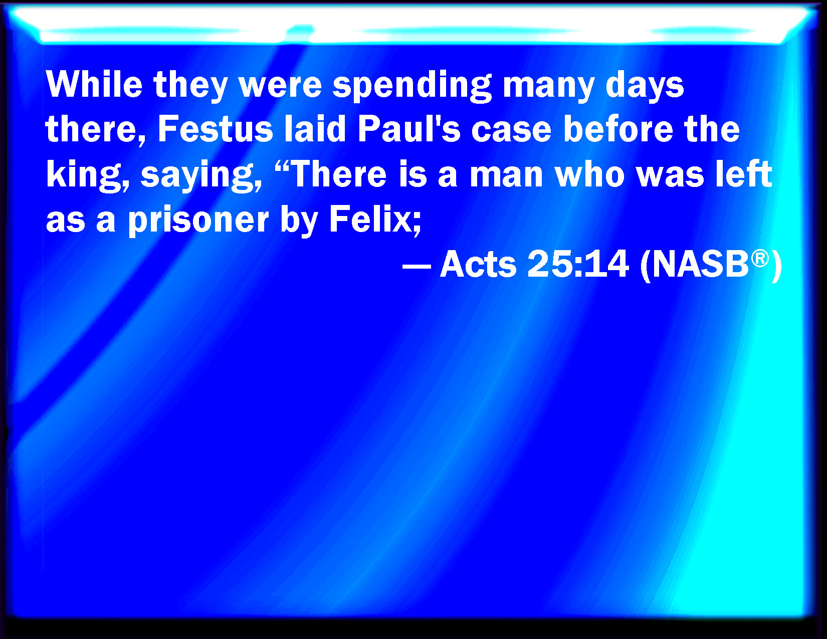 Bible Verse Slide Acts 25:14 And when they had been there many days, Festus declared Paul's cause to the king, saying, There is a certain man left in bonds by Felix: KJV: And when they had been there many days, Festus declared Paul's cause unto the king, saying, There is a certain man left in bonds by Felix: DRB: And as they tarried there many days, Festus told the king of Paul, saying: A certain man was left prisoner by Felix. DBT: And when they had spent many days there, Festus laid before the king the matters relating to Paul, saying, There is a certain man left prisoner by Felix, ERV: And as they tarried there many days, Festus laid Paul's case before the king, saying, There is a certain man left a prisoner by Felix: WBT: And when they had been there many days, Festus declared Paul's cause to the king, saying, There is a certain man left in bonds by Felix: WEB: As he stayed there many days, Festus laid Paul's case before the king, saying, "There is a certain man left a prisoner by Felix; YLT: and as they were continuing there more days, Festus submitted to the king the things concerning Paul, saying, 'There is a certain man, left by Felix, a prisoner,Links Acts 25:14 NIV • Acts 25:14 NLT • Acts 25:14 ESV • Acts 25:14 NASB • Acts 25:14 KJV • Acts 25:14 Interlinear • Acts 25:14 Commentaries • Acts 25:14 Parallel Texts • Acts 25:14 Bible Apps • Acts 25:14 Parallel • Bible Hub |
