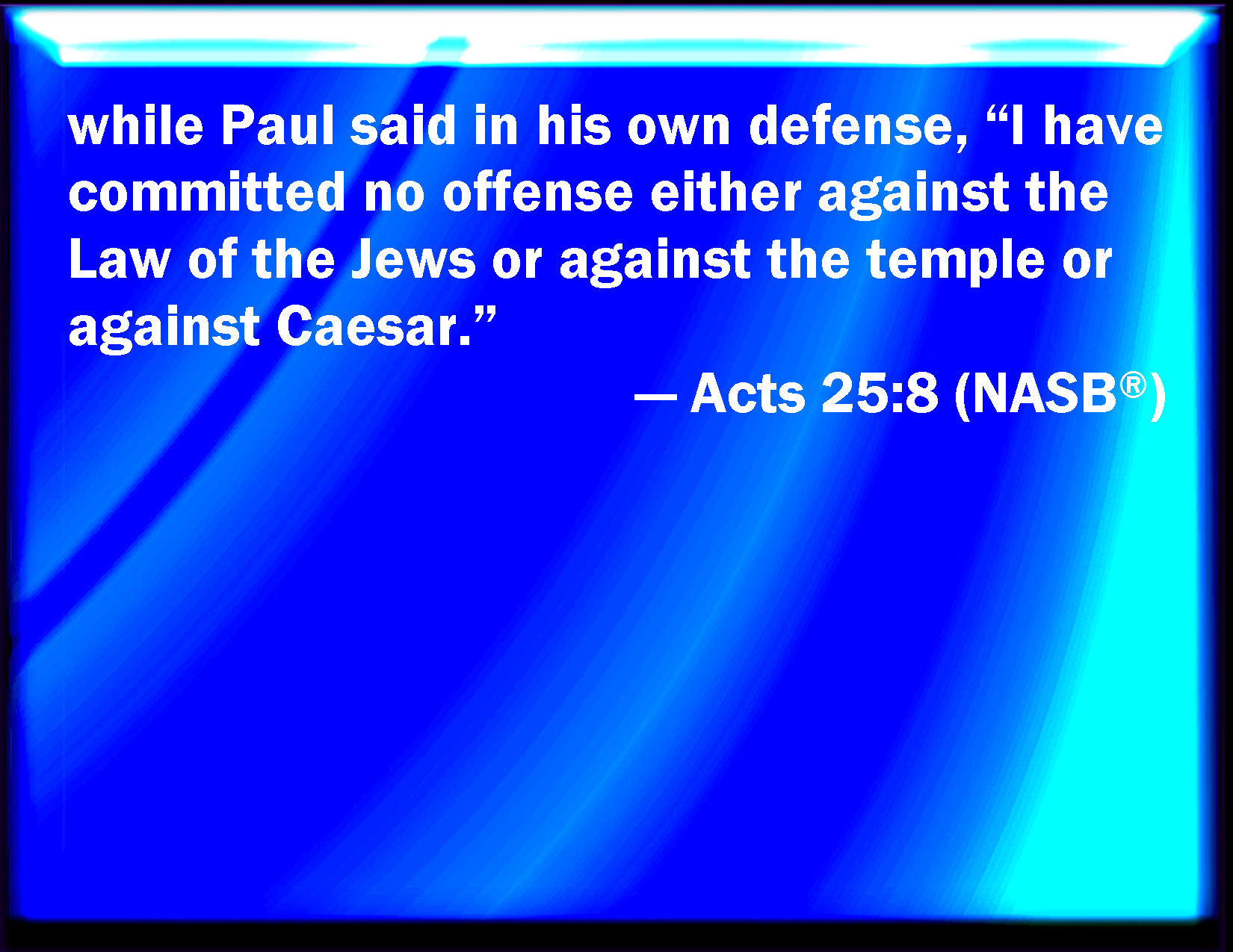 Bible Verse Slide Acts 25:8 While he answered for himself, Neither against the law of the Jews, neither against the temple, nor yet against Caesar, have I offended any thing at all. KJV: While he answered for himself, Neither against the law of the Jews, neither against the temple, nor yet against Caesar, have I offended any thing at all. DRB: Paul making answer for himself: Neither against the law of the Jews, nor against the temple, nor against Caesar, have I offended in any thing. DBT: Paul answering for himself, Neither against the law of the Jews, nor against the temple, nor against Caesar, have I offended in anything. ERV: while Paul said in his defence, Neither against the law of the Jews, nor against the temple, nor against Caesar, have I sinned at all. WBT: While he answered for himself, Neither against the law of the Jews, neither against the temple, nor yet against Cesar have I committed any offense. WEB: while he said in his defense, "Neither against the law of the Jews, nor against the temple, nor against Caesar, have I sinned at all." YLT: he making defence — 'Neither in regard to the law of the Jews, nor in regard to the temple, nor in regard to Caesar — did I commit any sin.'Links Acts 25:8 NIV • Acts 25:8 NLT • Acts 25:8 ESV • Acts 25:8 NASB • Acts 25:8 KJV • Acts 25:8 Interlinear • Acts 25:8 Commentaries • Acts 25:8 Parallel Texts • Acts 25:8 Bible Apps • Acts 25:8 Parallel • Bible Hub |