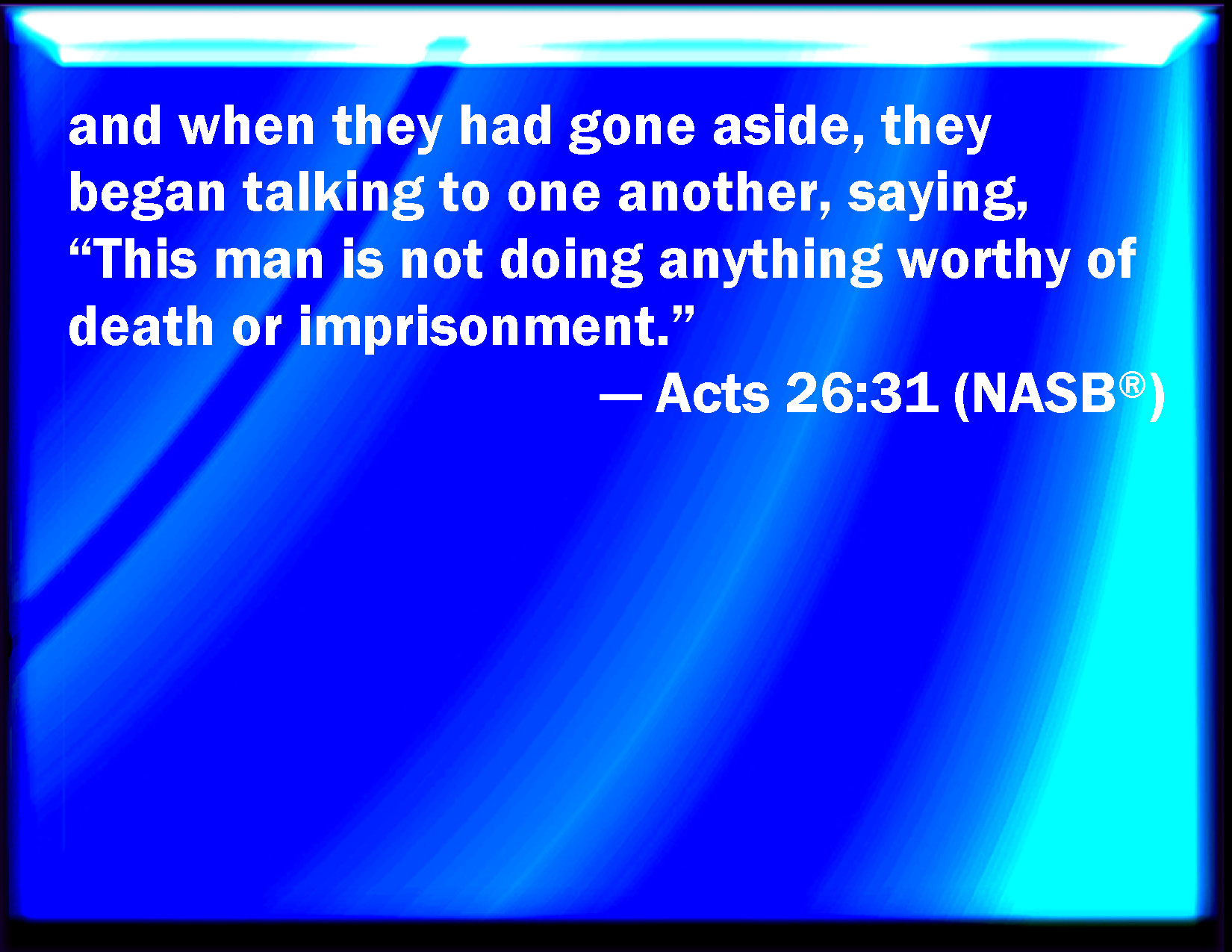 Bible Verse Slide Acts 26:31 And when they were gone aside, they talked between themselves, saying, This man does nothing worthy of death or of bonds. KJV: And when they were gone aside, they talked between themselves, saying, This man doeth nothing worthy of death or of bonds. DRB: And when they were gone aside, they spoke among themselves, saying: This man hath done nothing worthy of death or of bands. DBT: and having gone apart, they spoke to one another saying, This man does nothing worthy of death or of bonds. ERV: and when they had withdrawn, they spake one to another, saying, This man doeth nothing worthy of death or of bonds. WBT: And when they had gone aside, they talked between themselves, saying, This man doeth nothing worthy of death, or of bonds. WEB: When they had withdrawn, they spoke one to another, saying, "This man does nothing worthy of death or of bonds." YLT: and having withdrawn, they were speaking unto one another, saying — 'This man doth nothing worthy of death or of bonds;'Links Acts 26:31 NIV • Acts 26:31 NLT • Acts 26:31 ESV • Acts 26:31 NASB • Acts 26:31 KJV • Acts 26:31 Interlinear • Acts 26:31 Commentaries • Acts 26:31 Parallel Texts • Acts 26:31 Bible Apps • Acts 26:31 Parallel • Bible Hub |