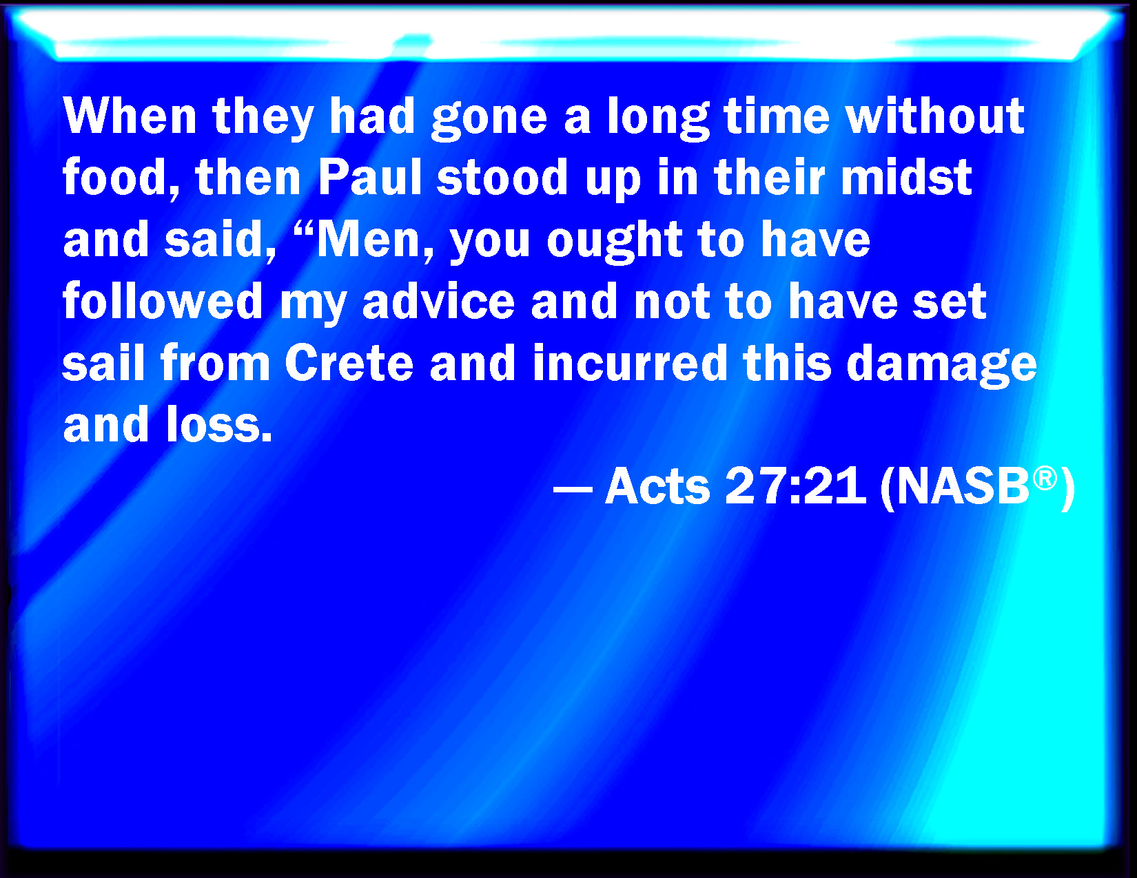 Bible Verse Slide Acts 27:21 But after long abstinence Paul stood forth in the middle of them, and said, Sirs, you should have listened to me, and not have loosed from Crete, and to have gained this harm and loss. KJV: But after long abstinence Paul stood forth in the midst of them, and said, Sirs, ye should have hearkened unto me, and not have loosed from Crete, and to have gained this harm and loss. DRB: And after they had fasted a long time, Paul standing forth in the midst of them, said: You should indeed, O ye men, have hearkened unto me, and not have loosed from Crete, and have gained this harm and loss. DBT: And when they had been a long while without taking food, Paul then standing up in the midst of them said, Ye ought, O men, to have hearkened to me, and not have made sail from Crete and have gained this disaster and loss. ERV: And when they had been long without food, then Paul stood forth in the midst of them, and said, Sirs, ye should have hearkened unto me, and not have set sail from Crete, and have gotten this injury and loss. WBT: But after long abstinence, Paul stood forth in the midst of them, and said, Sirs, ye should have hearkened to me, and not have loosed from Crete, and to have gained this harm and loss. WEB: When they had been long without food, Paul stood up in the middle of them, and said, "Sirs, you should have listened to me, and not have set sail from Crete, and have gotten this injury and loss. YLT: And there having been long fasting, then Paul having stood in the midst of them, said, 'It behoved you, indeed, O men — having hearkened to me — not to set sail from Crete, and to save this hurt and damage;Links Acts 27:21 NIV • Acts 27:21 NLT • Acts 27:21 ESV • Acts 27:21 NASB • Acts 27:21 KJV • Acts 27:21 Interlinear • Acts 27:21 Commentaries • Acts 27:21 Parallel Texts • Acts 27:21 Bible Apps • Acts 27:21 Parallel • Bible Hub |