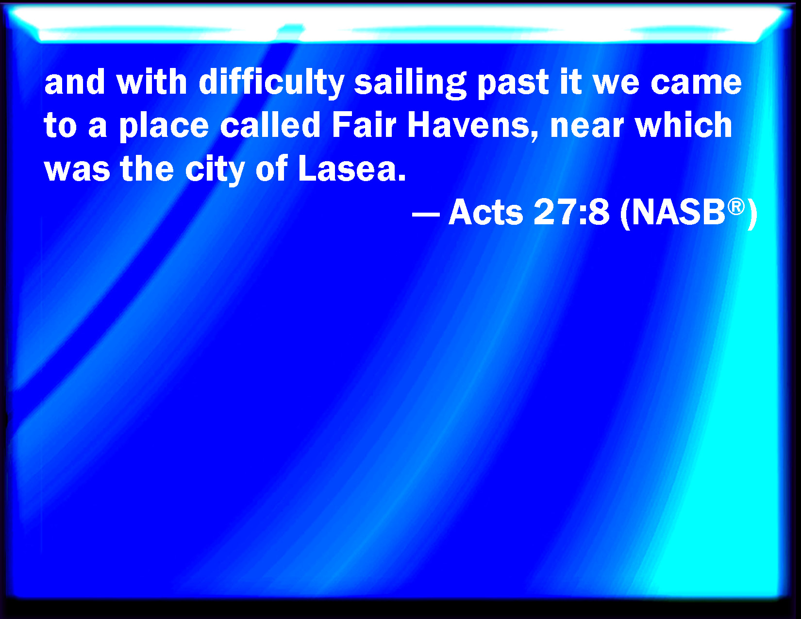 Bible Verse Slide Acts 27:8 And, hardly passing it, came to a place which is called The fair havens; near whereunto was the city of Lasea. KJV: And, hardly passing it, came unto a place which is called The fair havens; nigh whereunto was the city of Lasea. DRB: And with much ado sailing by it, we came into a certain place, which is called Good-havens, nigh to which was the city of Thalassa. DBT: and coasting it with difficulty we came to a certain place called Fair Havens, near to which was the city of Lasaea. ERV: and with difficulty coasting along it we came unto a certain place called Fair Havens; nigh whereunto was the city of Lasea. WBT: And hardly passing it, came to a place which is called, The fair havens; nigh to which was the city of Lasea. WEB: With difficulty sailing along it we came to a certain place called Fair Havens, near the city of Lasea. YLT: and hardly passing it, we came to a certain place called 'Fair Havens,' nigh to which was the city of Lasaea.Links Acts 27:8 NIV • Acts 27:8 NLT • Acts 27:8 ESV • Acts 27:8 NASB • Acts 27:8 KJV • Acts 27:8 Interlinear • Acts 27:8 Commentaries • Acts 27:8 Parallel Texts • Acts 27:8 Bible Apps • Acts 27:8 Parallel • Bible Hub |