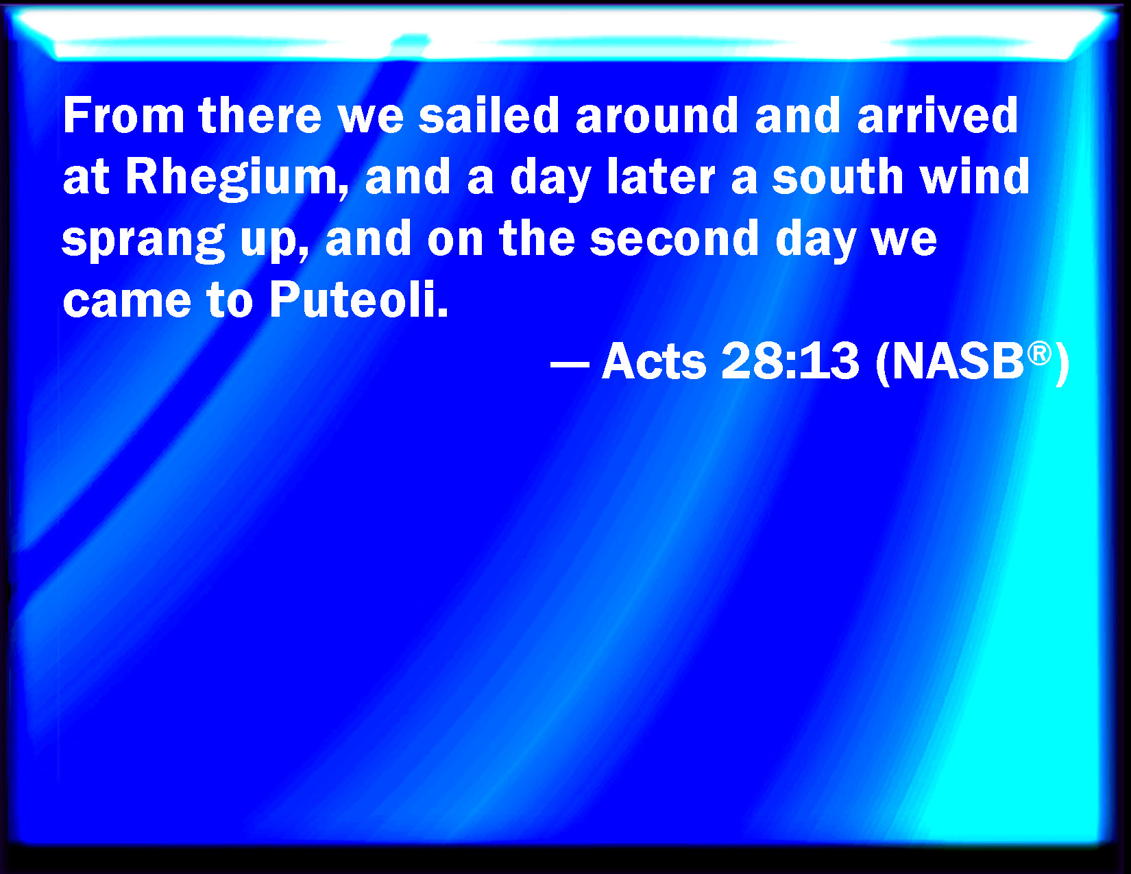 Bible Verse Slide Acts 28:13 And from there we fetched a compass, and came to Rhegium: and after one day the south wind blew, and we came the next day to Puteoli: KJV: And from thence we fetched a compass, and came to Rhegium: and after one day the south wind blew, and we came the next day to Puteoli: DRB: From thence, compassing by the shore, we came to Rhegium: and after one day, the south wind blowing, we came the second day to Puteoli; DBT: Whence, going in a circuitous course, we arrived at Rhegium; and after one day, the wind having changed to south, on the second day we came to Puteoli, ERV: And from thence we made a circuit, and arrived at Rhegium: and after one day a south wind sprang up, and on the second day we came to Puteoli: WBT: And from thence we made a circuit, and came to Rhegium: and after one day the south wind blew, and we came the next day to Puteoli: WEB: From there we circled around and arrived at Rhegium. After one day, a south wind sprang up, and on the second day we came to Puteoli, YLT: thence having gone round, we came to Rhegium, and after one day, a south wind having sprung up, the second day we came to Puteoli;Links Acts 28:13 NIV • Acts 28:13 NLT • Acts 28:13 ESV • Acts 28:13 NASB • Acts 28:13 KJV • Acts 28:13 Interlinear • Acts 28:13 Commentaries • Acts 28:13 Parallel Texts • Acts 28:13 Bible Apps • Acts 28:13 Parallel • Bible Hub |