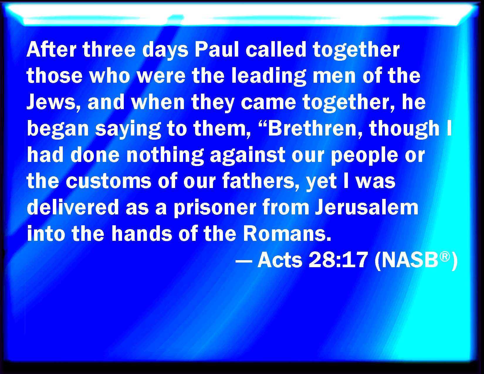 Bible Verse Slide Acts 28:17 And it came to pass, that after three days Paul called the chief of the Jews together: and when they were come together, he said to them, Men and brothers, though I have committed nothing against the people, or customs of our fathers, yet was I delivered prisoner from Jerusalem into the hands of the Romans. KJV: And it came to pass, that after three days Paul called the chief of the Jews together: and when they were come together, he said unto them, Men and brethren, though I have committed nothing against the people, or customs of our fathers, yet was I delivered prisoner from Jerusalem into the hands of the Romans. DRB: And after the third day, he called together the chief of the Jews. And when they were assembled, he said to them: Men, brethren, I, having done nothing against the people, or the custom of our fathers, was delivered prisoner from Jerusalem into the hands of the Romans; DBT: And it came to pass after three days, that he called together those who were the chief of the Jews; and when they had come together he said to them, Brethren, I having done nothing against the people or the customs of our forefathers, have been delivered a prisoner from Jerusalem into the hands of the Romans, ERV: And it came to pass, that after three days he called together those that were the chief of the Jews: and when they were come together, he said unto them, I, brethren, though I had done nothing against the people, or the customs of our fathers, yet was delivered prisoner from Jerusalem into the hands of the Romans: WBT: And it came to pass, that after three days, Paul called together the chief of the Jews. And when they were assembled, he said to them, Men, brethren, though I have committed nothing against the people, or customs of our fathers, yet I was delivered prisoner from Jerusalem into the hands of the Romans. WEB: It happened that after three days Paul called together those who were the leaders of the Jews. When they had come together, he said to them, "I, brothers, though I had done nothing against the people, or the customs of our fathers, still was delivered prisoner from Jerusalem into the hands of the Romans, YLT: And it came to pass after three days, Paul called together those who are the principal men of the Jews, and they having come together, he said unto them: 'Men, brethren, I — having done nothing contrary to the people, or to the customs of the fathers — a prisoner from Jerusalem, was delivered up to the hands of the Romans;Links Acts 28:17 NIV • Acts 28:17 NLT • Acts 28:17 ESV • Acts 28:17 NASB • Acts 28:17 KJV • Acts 28:17 Interlinear • Acts 28:17 Commentaries • Acts 28:17 Parallel Texts • Acts 28:17 Bible Apps • Acts 28:17 Parallel • Bible Hub |